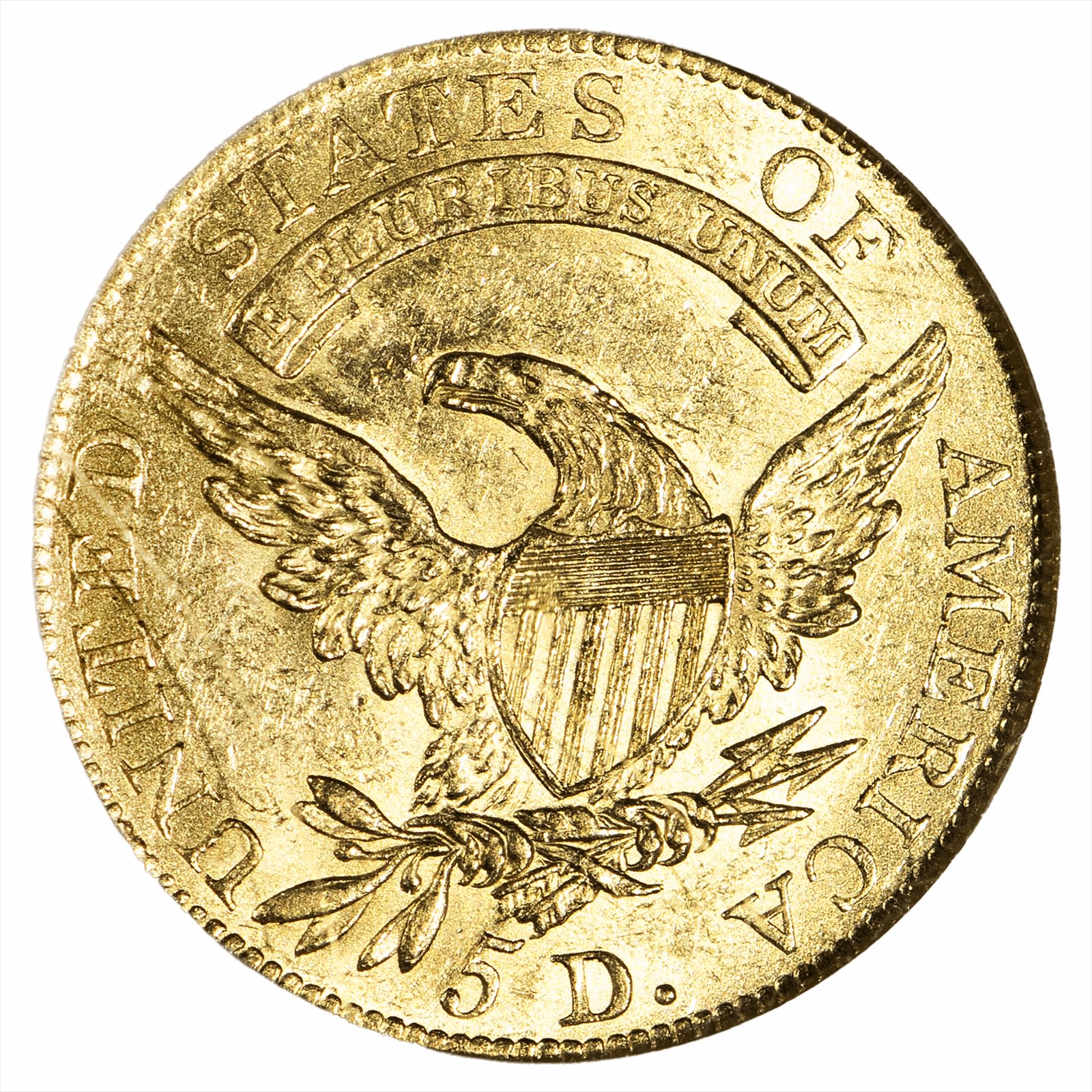 Draped Bust Left $5 Gold Half Eagle (1807-1812) A Short lived Variety of design that was replaced with the Capped head in 1813. The series saw several varieties such as over dates and use of Small and Large Letters on both the Obverse and Reverse. The run was replaced by the Capped Head design in 1813. Of note the $5 denomination is the only gold piece to be minted at all eight US mints as the West Point mint produced them in bullion and commemorative forms.