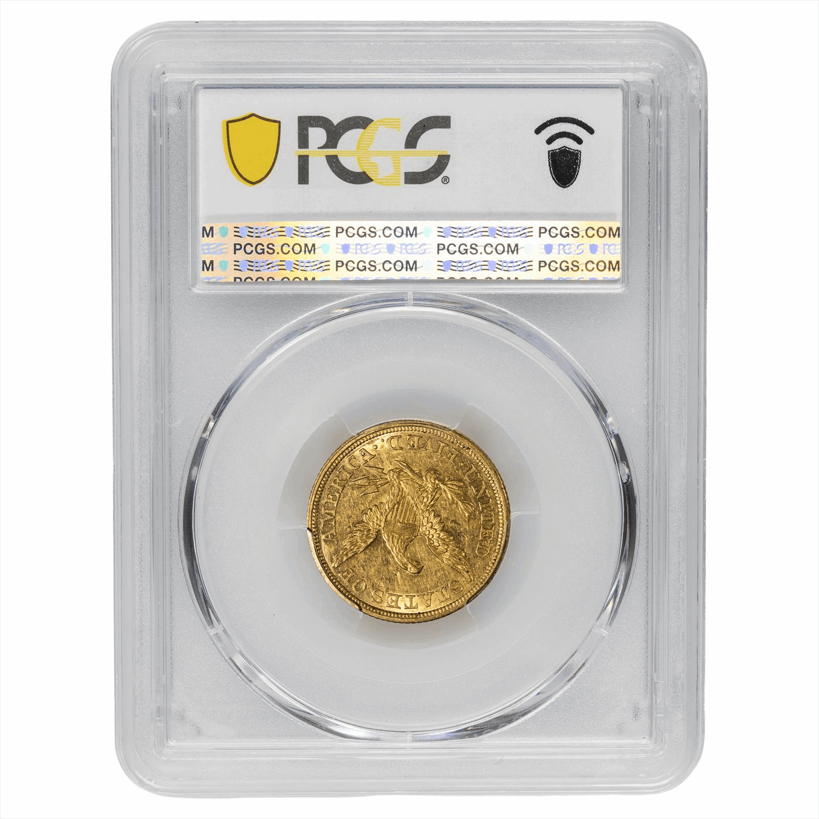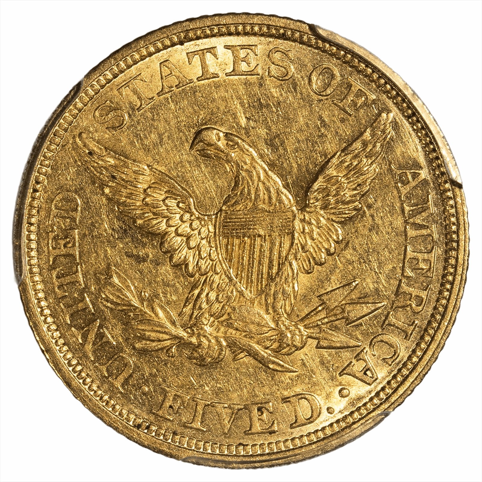Product Details: 1844 $5 Gold Coin, PCGS AU 58, is a remarkable piece of American numismatic history, showcasing intricate craftsmanship and historical significance. It features the iconic Liberty design, where Lady Liberty is depicted in profile, adorned with a braided hair style, emphasizing elegance and strength. The year '1844' is prominently displayed, highlighted by thirteen stars representing the original colonies, encircling her portrait. The coin is encapsulated in a certified holder by PCGS, assuring its quality with an AU58 grade, indicating light wear consistent with high circulation while retaining much of its original luster. The reverse side showcases the majestic eagle, a symbol of freedom, holding arrows and an olive branch, further underscoring America’s values during the mid-19th century; the inscription 'UNITED STATES OF AMERICA' elegantly wraps around the design. This coin weighs approximately 8.36 grams and has a diameter of 25 mm, composed of 90% gold and 10% copper, providing durability and enhancing its aesthetic appeal. Ideal for collectors, historians, or anyone passionate about precious metals, this 1844 $5 Gold Coin is not just a monetary item, but a tangible piece of history, embodying the spirit of its time and the artistry of coin minting.