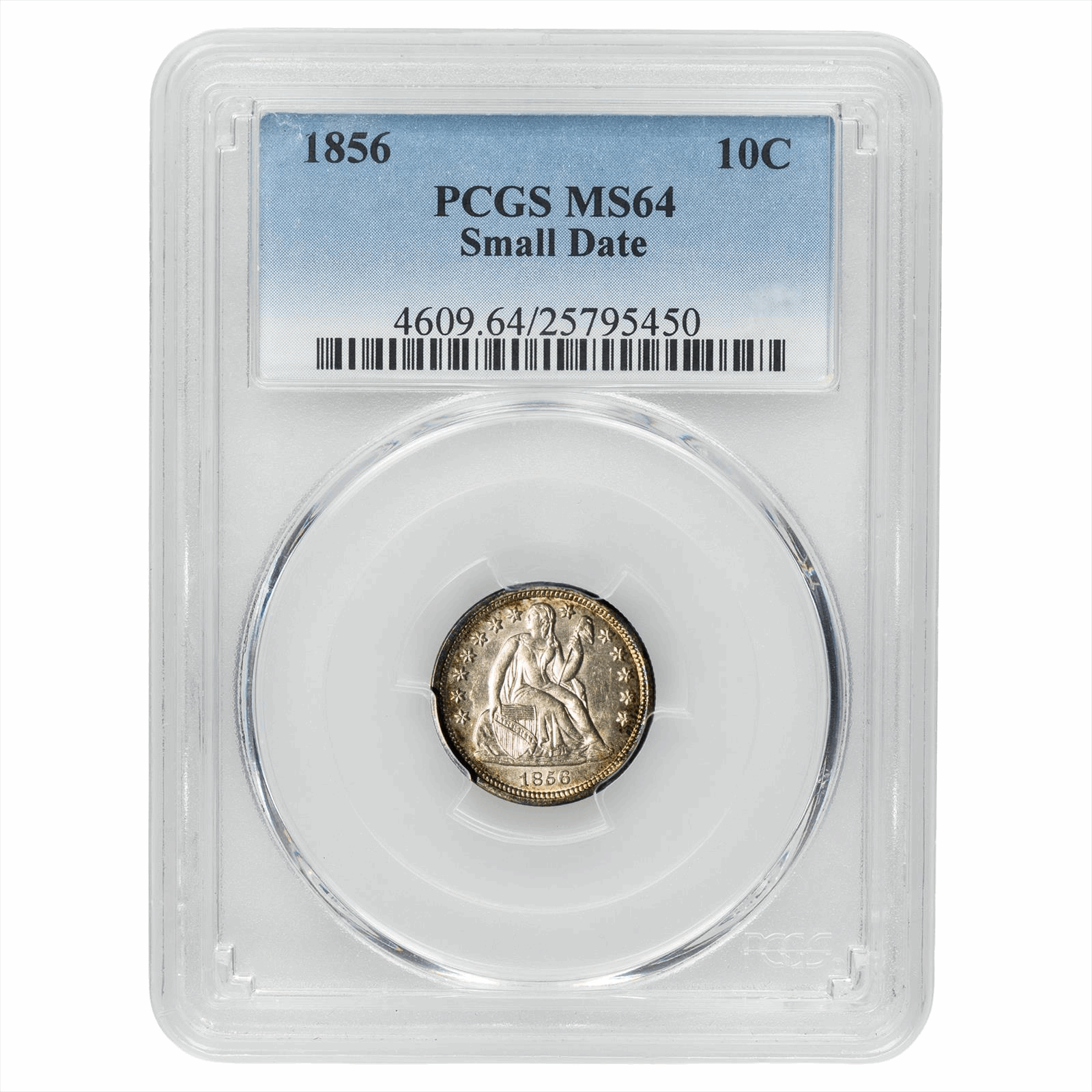 This is a PCGS graded coin. You will receive the coin pictured. You are purchasing an 1856 Seated Liberty Dime graded PCGS MS 64. This is an excellent coin to add to your collection.