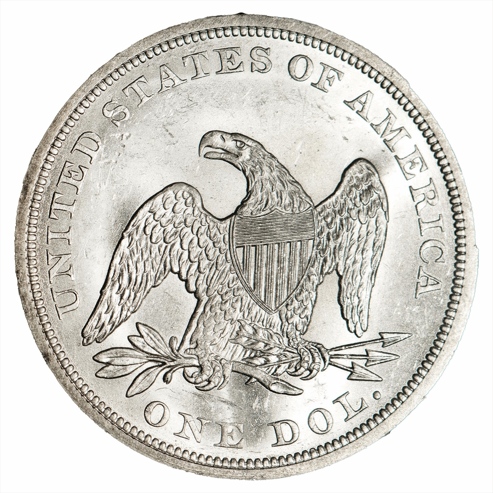 Seated Dollars (1840-1873) - No Motto (1840-1865) Silver dollar production was halted from 1804 until 1836, when Christian Gobrecht, at the direction of Mint director Robert Patterson, began producing his designs in advance of circulating production. He modeled the obverse after a drawing made by Thomas Sully. After three years, the Seated design was ready for use. Production began at the Philadelphia Mint in 1840 using the “modern” steam powered presses. The obverse featured Gobrecht’s seated Liberty rendering and a heraldic reverse eagle that features a smaller shield than the earlier Draped Bust type. The coins were produced without the motto “IN GOD WE TRUST” until the Civil War. These early seated examples were struck in relatively small quantities until production was increased in 1859. The No Motto type is beloved by dollar collectors as representations of a growing nation in the early part of the industrial revolution.