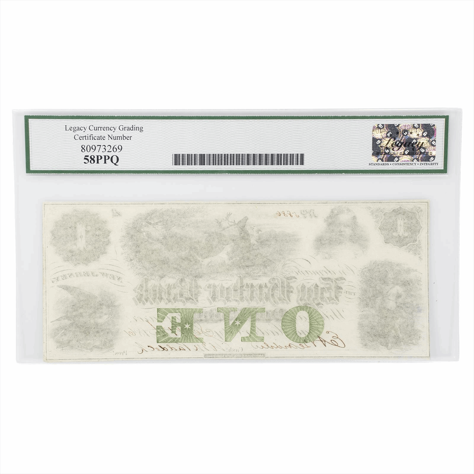 This is a Legacy graded note. You will receive the note pictured. You are purchasing an Egg Harbor Bank Egg Harbor City, NJ $1 graded Legacy 58 PPQ. This is an excellent note to add to your collection.