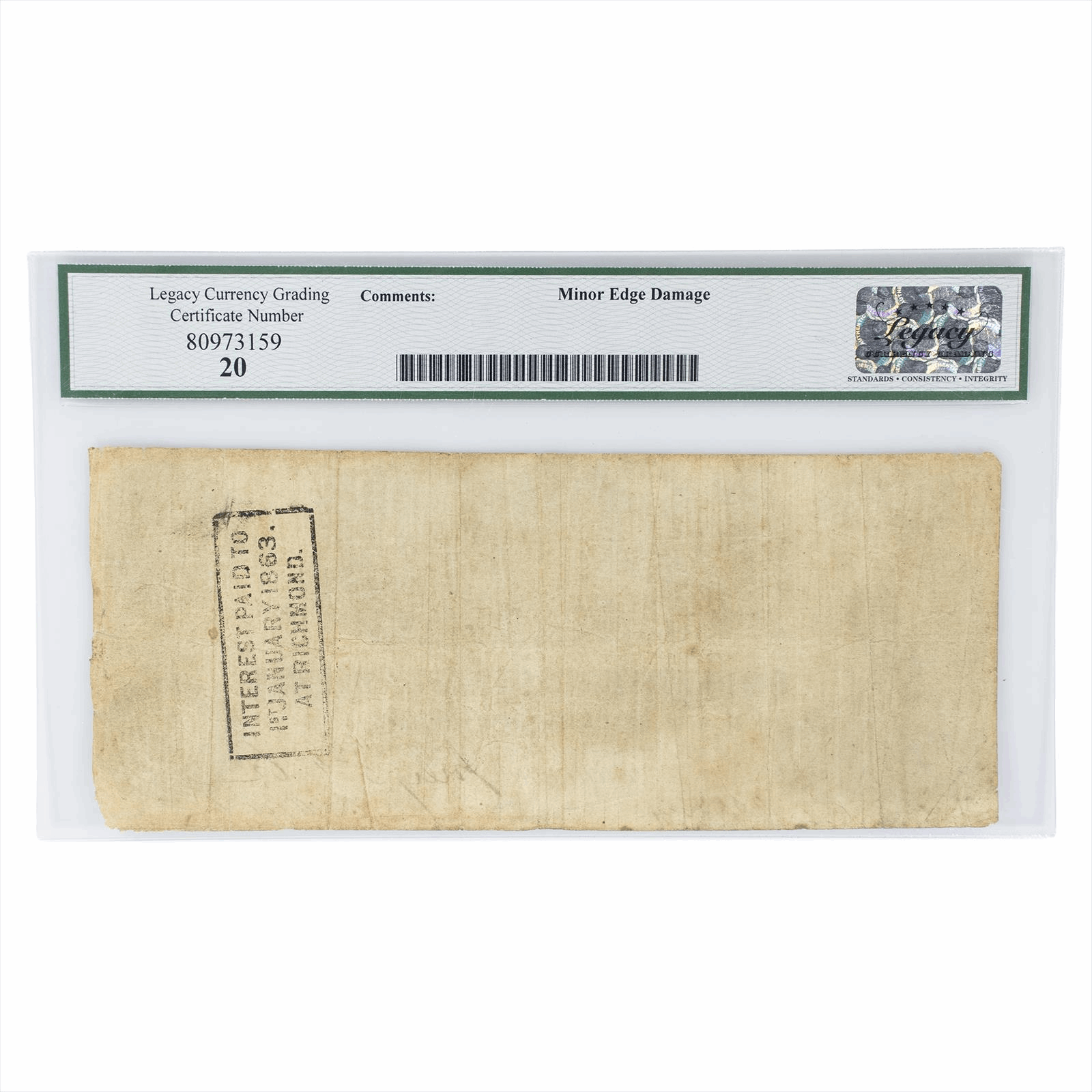 This is a Legacy graded note. You will receive the note pictured. You are purchasing an 1862 Confederate States of America Note graded Legacy VF 20. This is an excellent note to add to your collection.