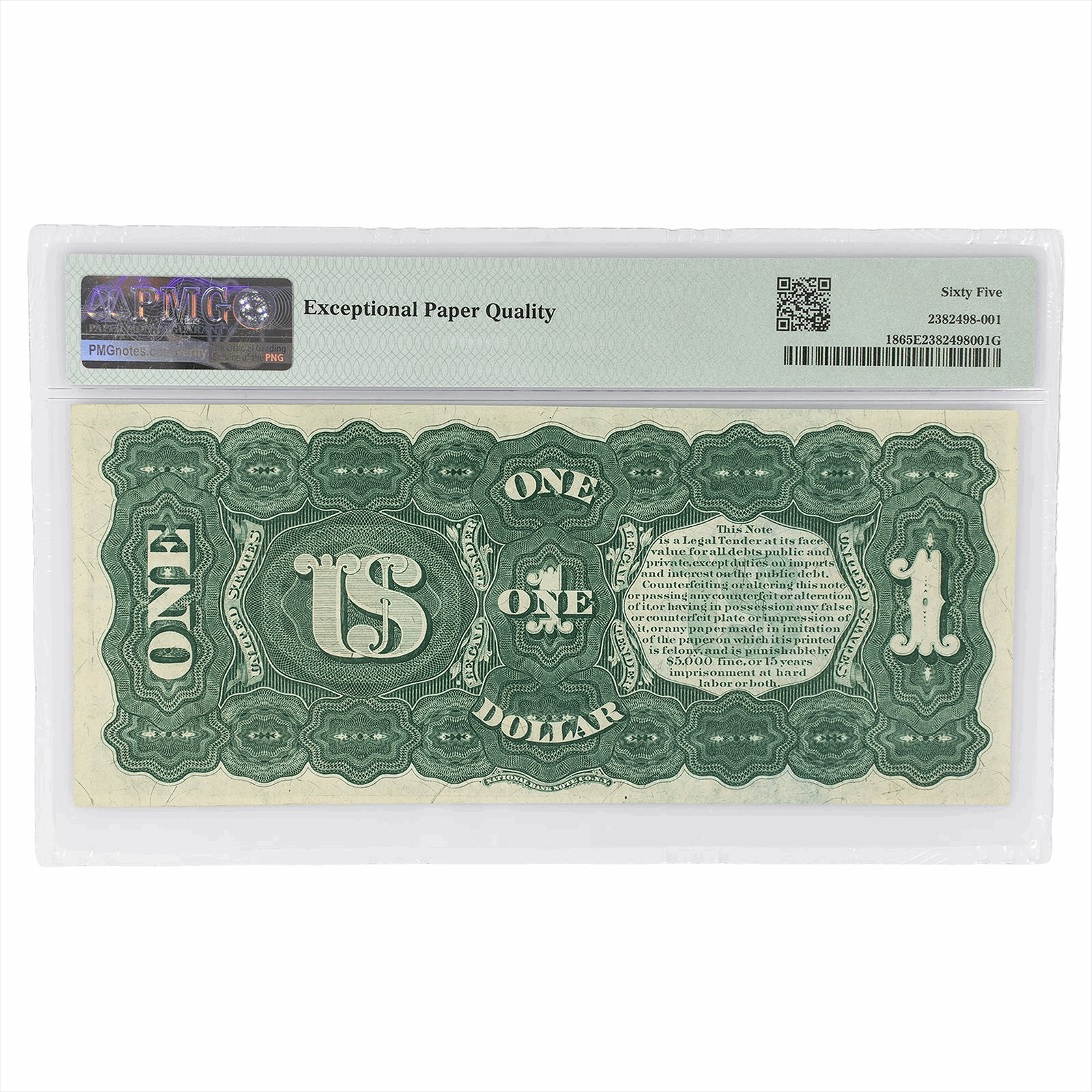 This is a PMG graded note. You will receive the pictured Note. You are Buying a Fr. 18 $1 1869 Legal Tender graded Gem Uncirculated 65 EPQ by PMG. The series is known as 'Rainbow Notes.' A nicely centered example with excellent colors of the rainbow. This is an outstanding piece of currency with stellar print quality coupled with originality, earning this piece its EPQ designation. Appearances at auction of aces at this level are not too common. PMG has graded 2268 of these with 73 pieces at or above this level. This is an excellent Note to add to your collection.