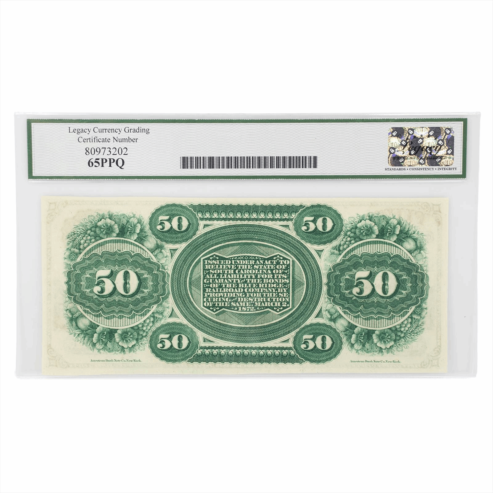 This is a Legacy graded note. You will receive the note pictured. You are purchasing a CR8 State of South Carolina Columbia, SC $50 Revenue Bond Script Legacy Gem New 65 PPQ. This is an excellent note to add to your collection.