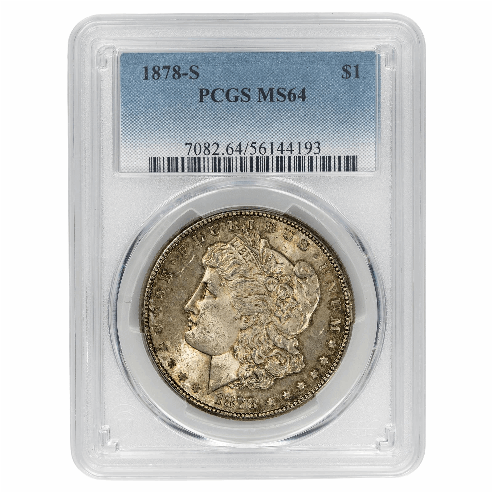 This is a PCGS graded coin. You will receive the coin pictured. You are purchasing an 1878-S Morgan Silver Dollar graded PCGS MS 64. This is an excellent coin to add to your collection.