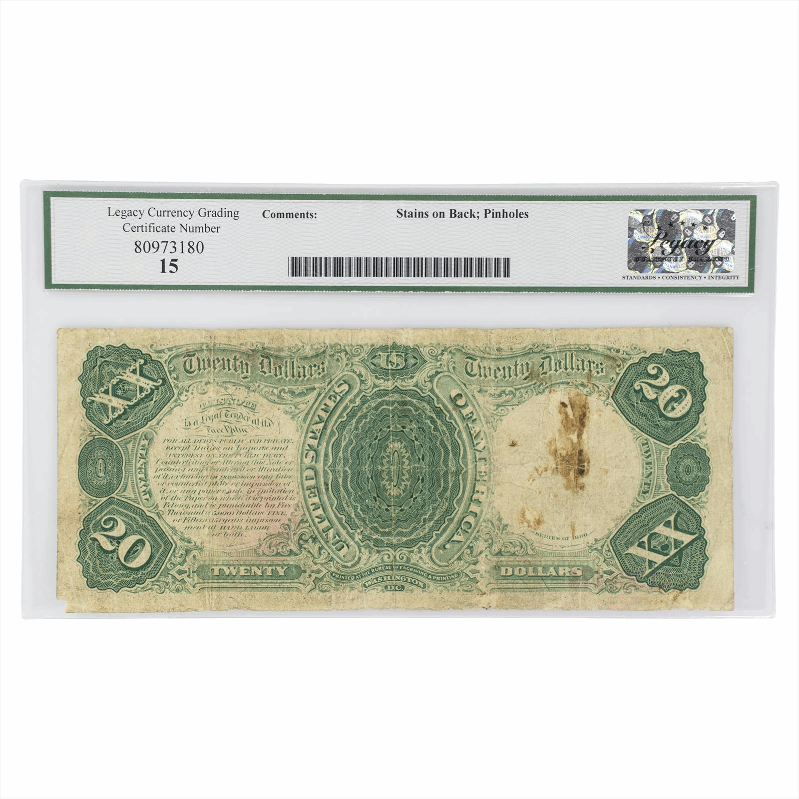 Product Details: 1880 $20 Legal Tender Note, Fr. 146, featuring a portrait of a prominent historical figure. This note is characterized by intricate engravings and historical significance, making it a valuable addition for collectors. Graded Fine 15, it displays the following features: - Serial Number: A195447A - Plate Number: C22 - Clear legal tender statement Condition notes: - Minimal wear typical for its age - Stains observed on the reverse side - Presence of pinholes noted A remarkable piece of American currency history, perfect for those interested in numismatics.