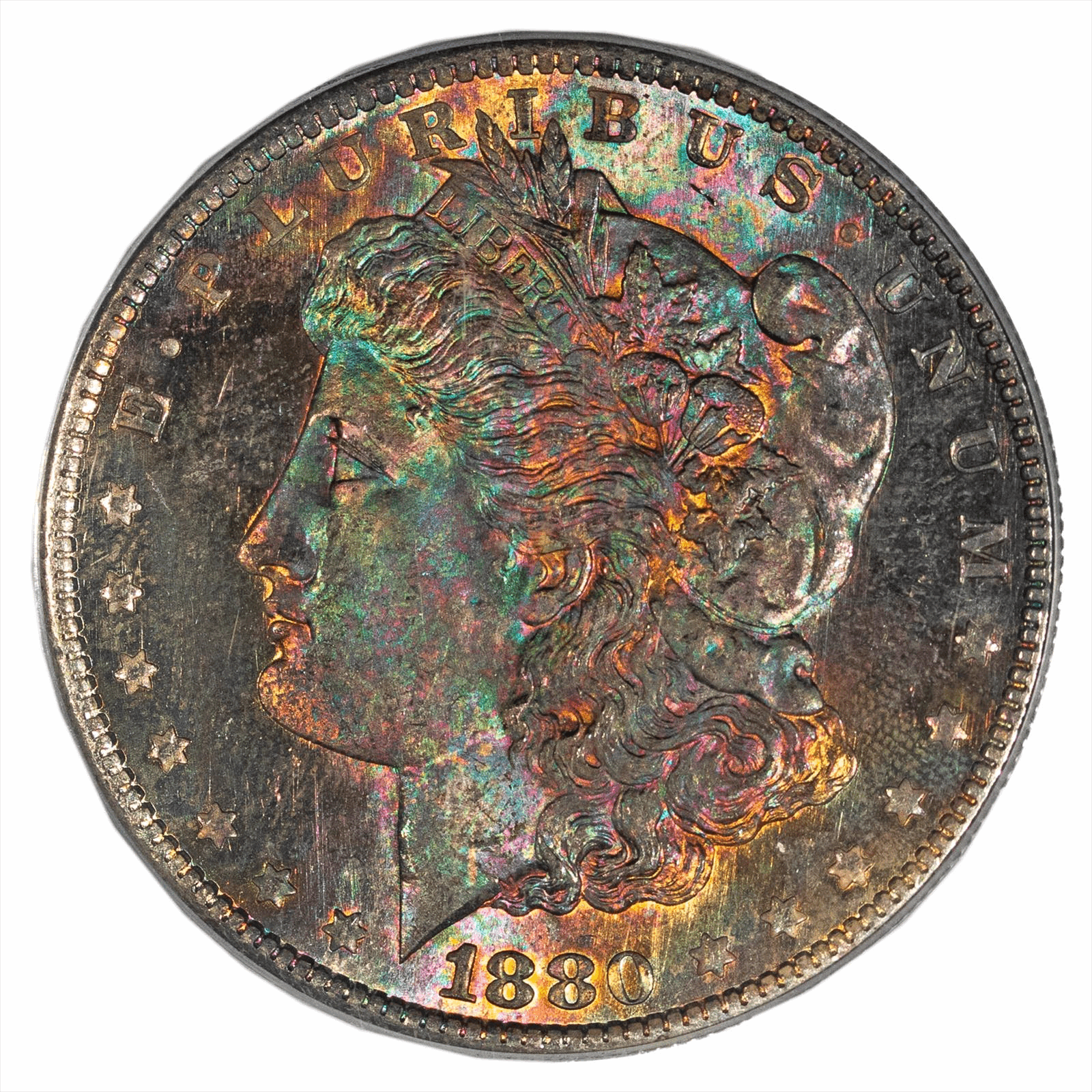 Product Details: Step into the storied history of American coinage with this breathtaking 1880-S Morgan Silver Dollar. Struck at the esteemed San Francisco Mint—known for its superior coining quality—this coin is a testament to the nation's rich numismatic heritage. It has been professionally graded and encapsulated by PCGS (Professional Coin Grading Service) as Mint State 66 (MS 66), a highly coveted grade that signifies a coin of exceptional quality and outstanding eye appeal. An MS 66 grade places this coin in the 'Gem Uncirculated' category. Coins in this grade exhibit full, original mint luster with a sharp strike and excellent visual presence. While some minor, scattered contact marks or hairlines may be present, they do not detract from the coin's overall superb appearance. This grade represents a perfect balance of preservation and value, making it a highly desirable piece for both serious collectors and discerning investors. What truly sets this specific coin apart is its spectacular rainbow toning. This vibrant and completely natural process occurs over decades as the coin's silver surface reacts with trace elements in its environment, such as sulfur from a canvas bag or a paper envelope. The resulting chemical reaction creates a thin layer of tarnish that diffracts light, much like a prism, creating a stunning display of color. The result is a unique, one-of-a-kind masterpiece, with hues of blue, red, gold, and green cascading across the coin's surface. This 'rainbow toning' is highly sought after by collectors and adds a significant premium to the coin's numismatic value. This 1880-S Morgan Silver Dollar is more than just a coin; it is a work of art, a piece of history, and a numismatic marvel. Its high-grade preservation, combined with the singular beauty of its natural rainbow toning, makes it an extraordinary find for any collection. Don't miss the opportunity to own this truly unique and captivating coin.