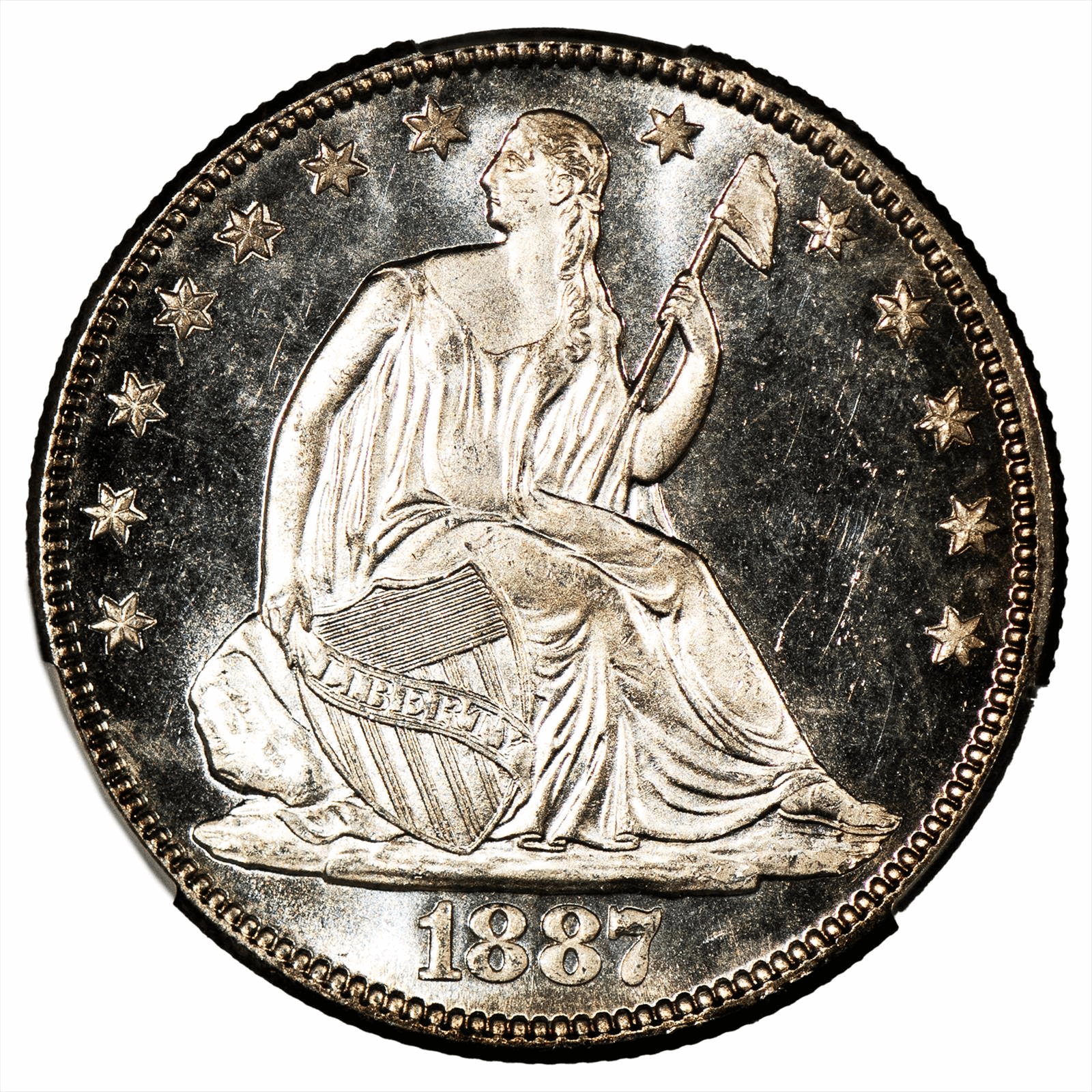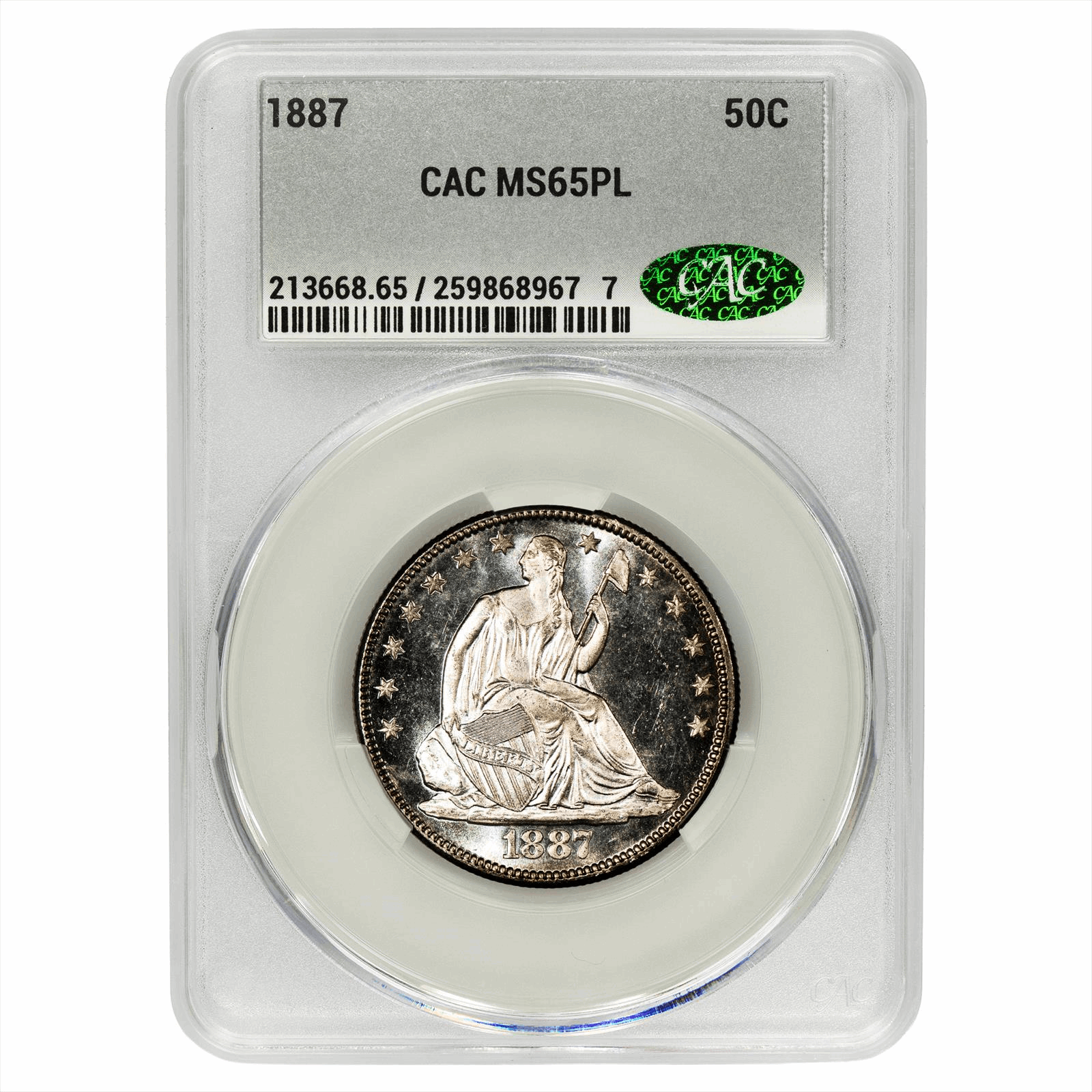 This is a CACG graded coin. You will receive the coin pictured. You are purchasing an 1887 Seated Liberty Half Dollar graded CACG MS 65 PL. This is an excellent coin to add to your collection.