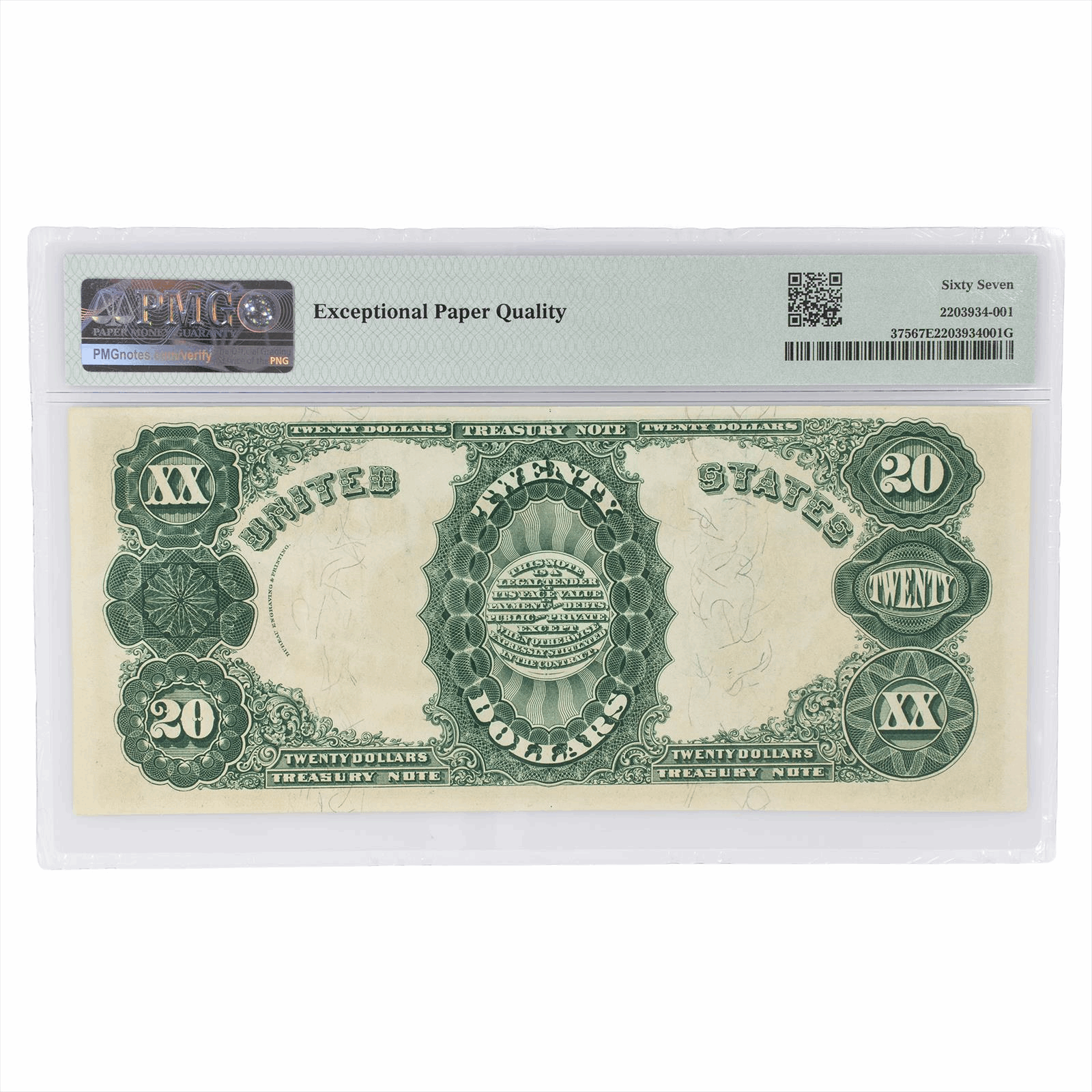 This is a PMG graded note and you will receive the pictured Note. You are Buying a sensational 1891 $20 Treasury Note, Fr. 375, graded by PMG 67 EPQ Superb Gem Uncirculated. This piece shows with an outstanding impression of the design with intricate detail of the ornate features used in the borders of the face. Seen with an open back format for the 1891 series which replaced the 'busy,' ornate backs of the 1890 series. This was primarily done for counterfeiting issues and was adopted in style by several other types. The quality is radiant with original paper and large margins which help confirm the Superb Gem designation by PMG. These treasury notes are always among the most difficult series to complete as all denominations are scarce to rare in Superb Gem Uncirculated grades. While PMG list 11 examples graded in 67 with none finer. This is an excellent Note to add to your collection.
