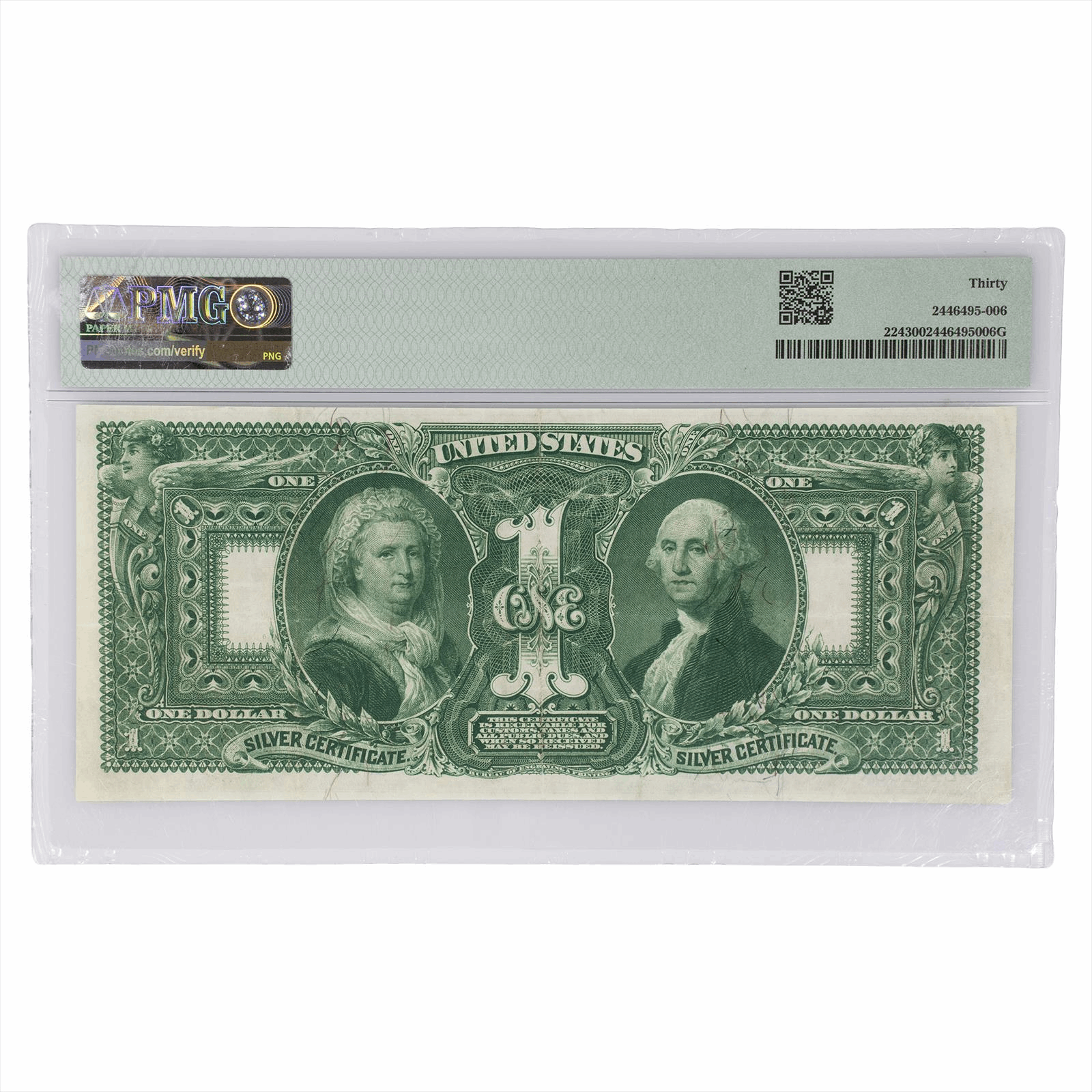Product Details: This 1896 $1 Silver Certificate (Fr#224) is a cornerstone of American numismatics, famously known as the 'Educational Note' for its stunning neoclassical artistry. The obverse features the celebrated 'History Instructing Youth' motif, depicting an allegorical woman pointing toward the U.S. Constitution against a backdrop of the Washington, D.C. skyline. Certified by PMG as Very Fine 30, this large-size note exhibits honest circulation with well-defined details and bold ink, maintaining the visual integrity of what many consider the most beautiful currency series ever produced. The reverse is equally historic, showcasing the only instance in U.S. history where both George and Martha Washington appear together on the same note.