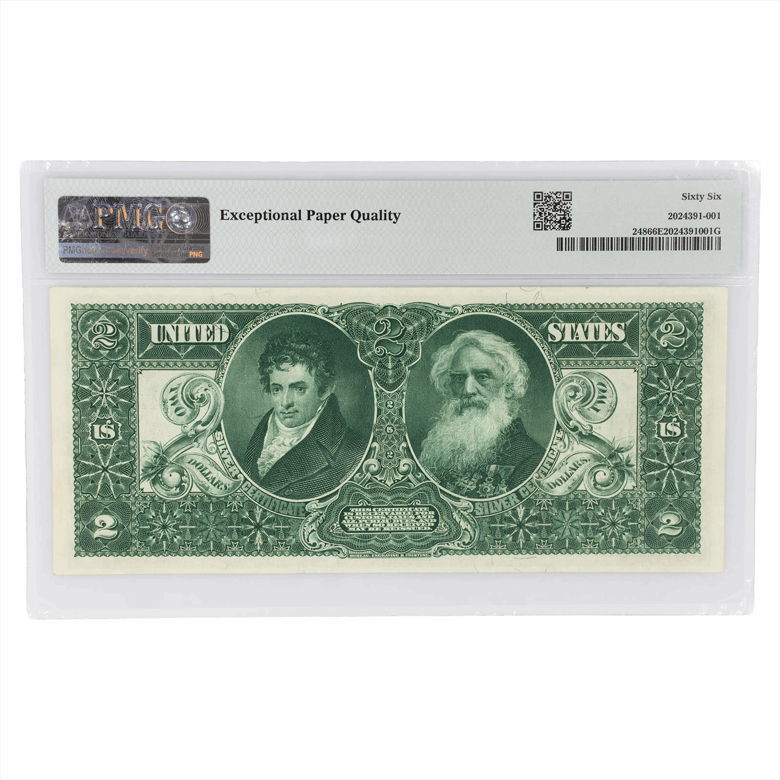 This is a PMG graded note and you will receive the pictured note. You are buying a 1896 $2 Educational Silver Certificate Duce graded 66 EPQ Gem Uncirculated by PMG.An impeccably centered, fully original and perfectly bright note which carries PMG's Exceptional Paper Quality endorsement. Both sides are perfectly centered among full margins, and the colors are as fresh as the day the note was made. As an additional bonus, this is the scarcer of the two signature combinations for Two Dollar Educational notes. In 1896, the United States released the Educational Series, an artistically inclined series of currency depicting three allegorical motifs that would become some of the most highly revered notes ever produced by our government. The $2 Education has the theme of Science Presenting Steam and Electricity to Industry and Commerce, a beautifully designed motif whose symbols are depicted by women. This is an excellent Note to add to your collection.