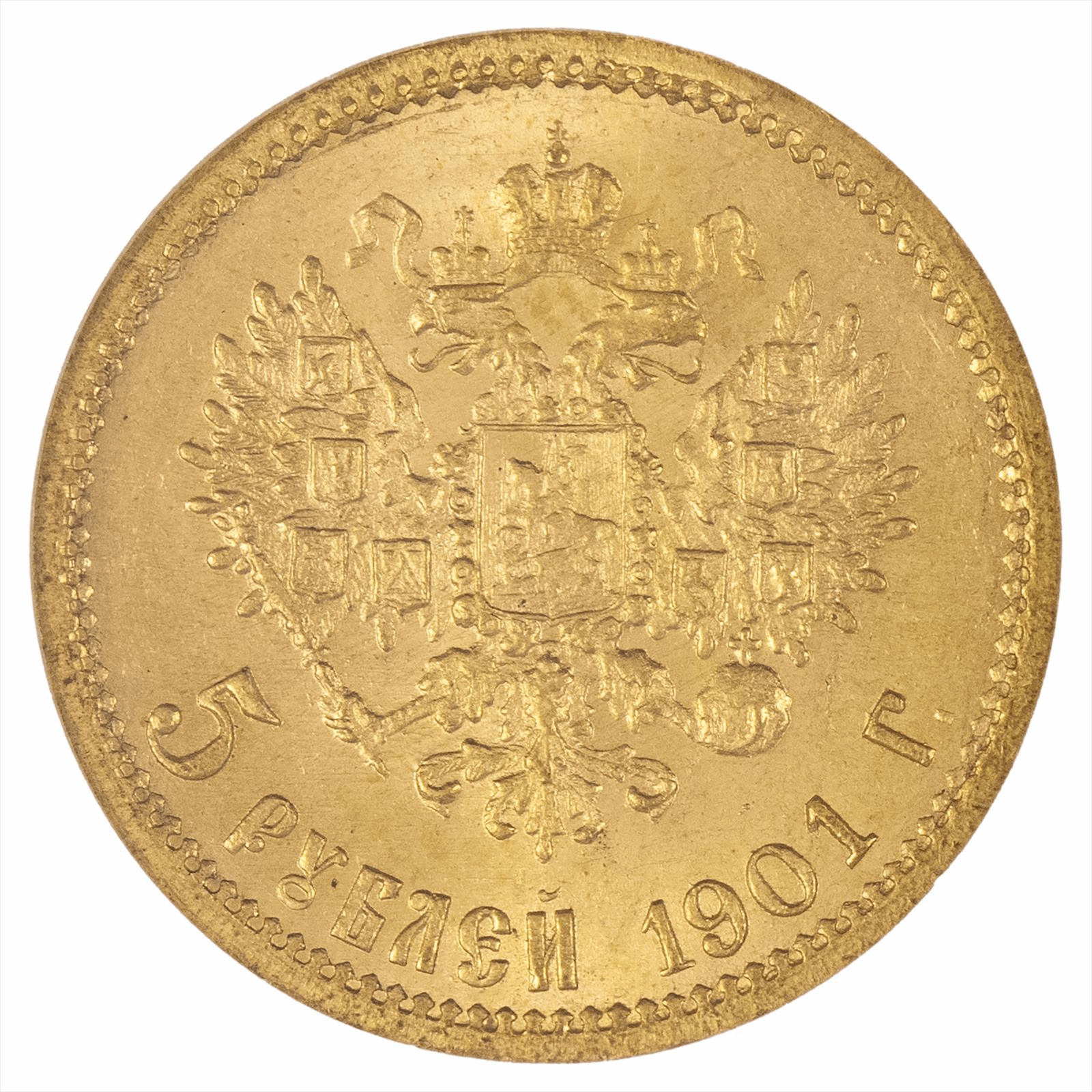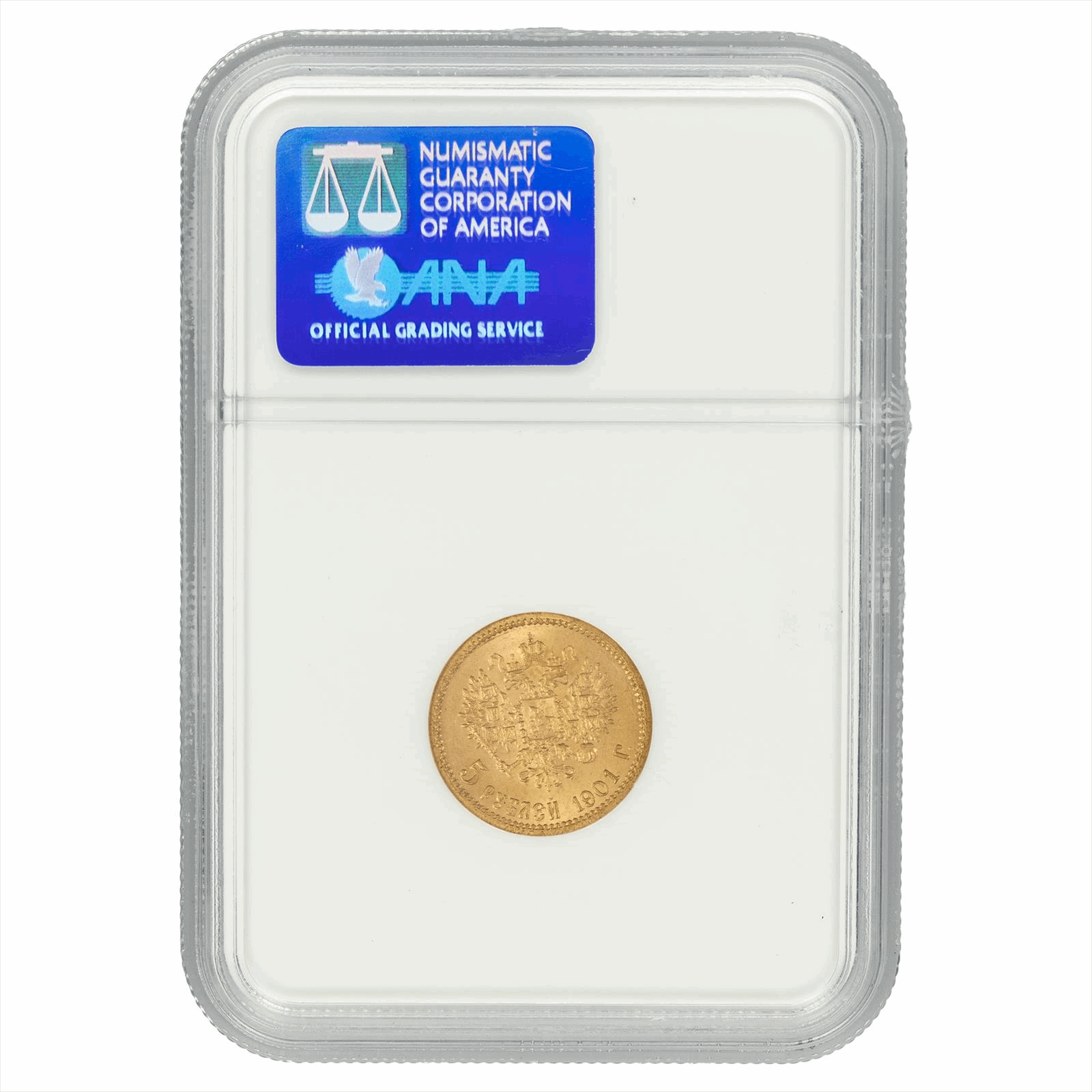 Product Details: A 1901 Russian 5 Rouble gold coin graded MS 66 by the Numismatic Guaranty Corporation. This stunning piece features intricate details and a striking portrait on the obverse, showcasing the artistry of its era. Encased in a protective slab, it offers both aesthetic appeal and investment value. Ideal for collectors and enthusiasts, this coin represents a significant piece of history, making it a valuable addition to any numismatic collection.