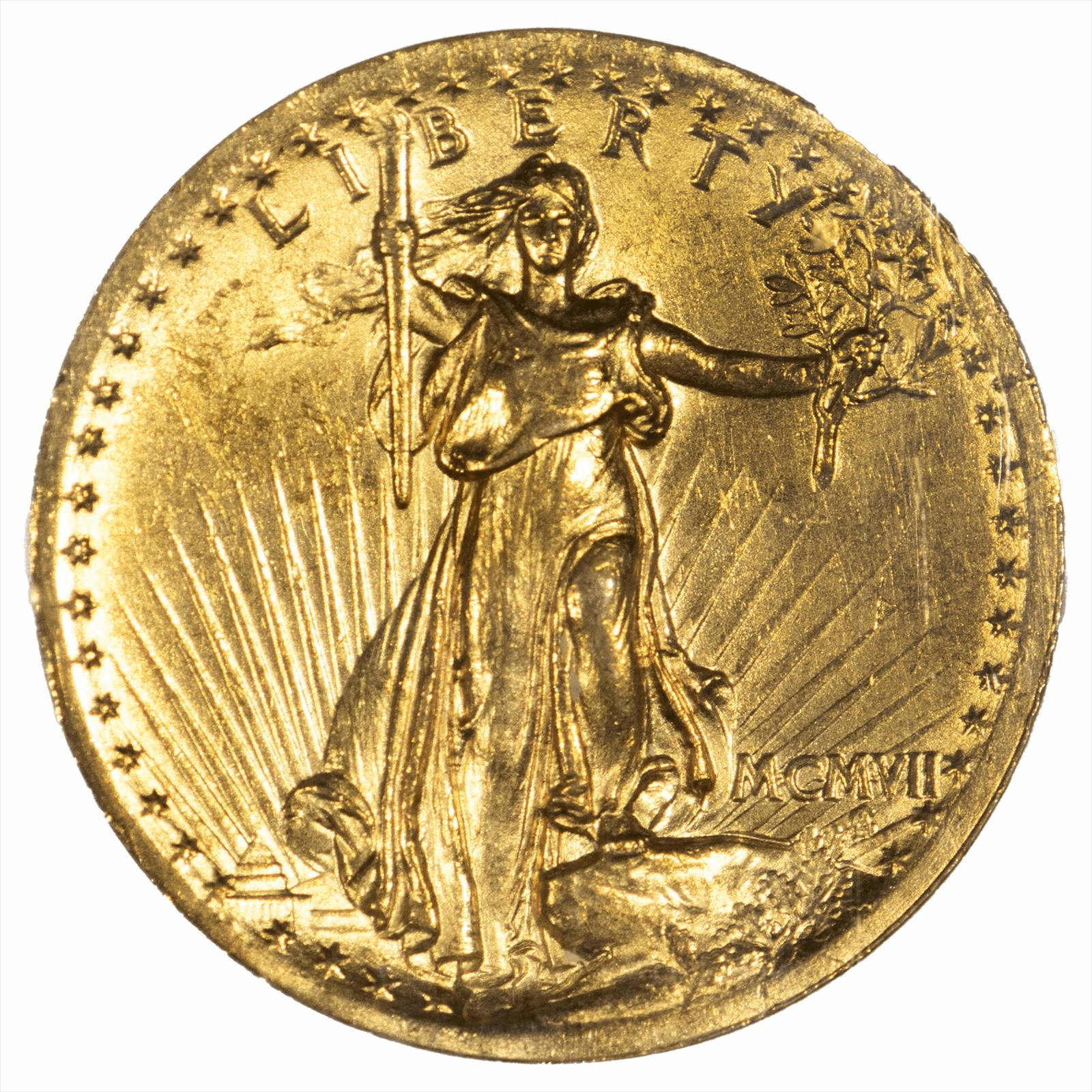 Saint Gaudens $20 Gold Double Eagle High Relief (MCMVII, 1907) A very popular 20th Century coin. The 1907 High Relief Saint-Gaudens Double Eagle is widely regarded as one of the most beautiful coins ever minted in the United States. Its creation was the result of a collaboration between President Theodore Roosevelt and renowned sculptor Augustus Saint-Gaudens, who sought to elevate American coinage to the artistic standards of ancient Greek and Roman coins. This specific coin is the 'Wire Edge' variety, a feature created during the minting process of the first-ever Saint-Gaudens Double Eagles.
