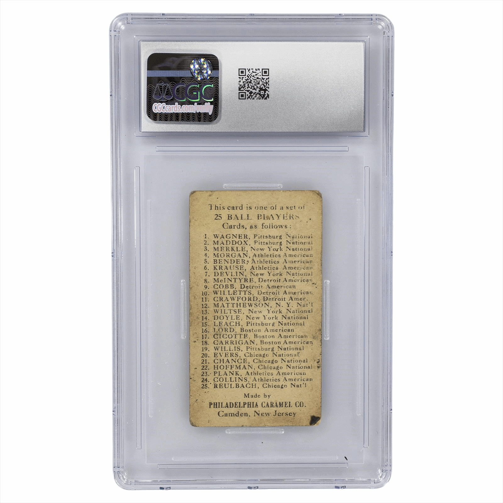 Product Details: 1909 E95 Philadelphia Caramel Solly Hofman trading card, graded CGC 1.5. This vintage collectible features an iconic image of Solly Hofman, a notable player from the early 20th century. The card is encapsulated in a protective case, ensuring its preservation and security for any collector. The reverse showcases a list of 25 baseball players from the set, made by the Philadelphia Caramel Company. This piece is not just a reminder of baseball history but also a significant addition to any serious collection. The fair condition rating indicates wear consistent with its age, adding to its uniqueness and charm. Perfect for enthusiasts of baseball memorabilia and vintage trading cards.
