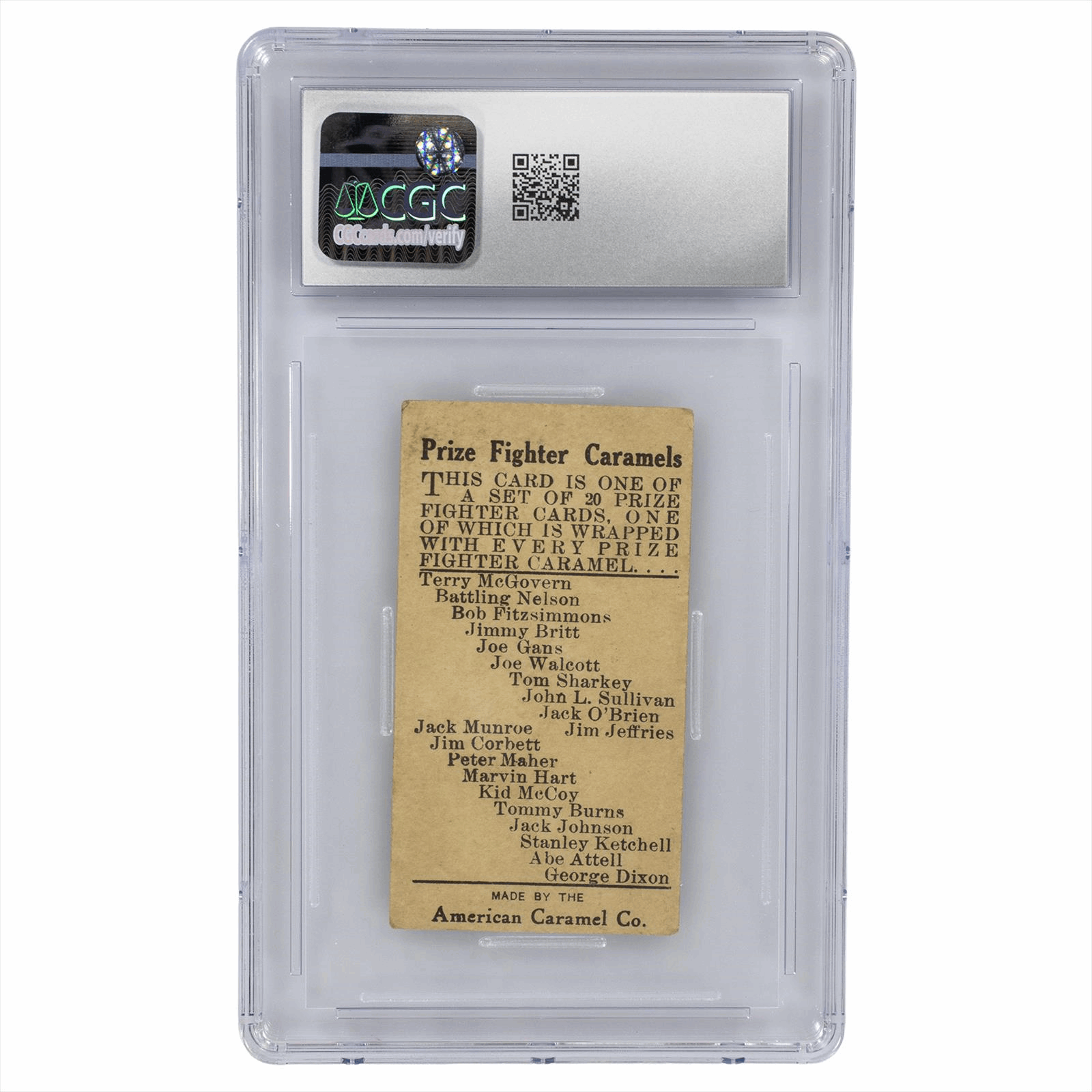 Product Details: 1910 E75 American Caramel Prize Fighters trading card featuring Stanley Ketchell. This unique collectible is encapsulated and graded in very good condition (3.5), ensuring its authenticity and preservation. The front showcases an illustrated portrait of Ketchell in a boxing stance, while the reverse provides historical context, noting that it’s part of a set of 20 cards issued with Prize Fighter Caramel candies. This card presents an exciting piece of boxing history for collectors and enthusiasts alike, encapsulating the early 20th-century sports culture. A must-have for anyone interested in boxing memorabilia or vintage card collections.