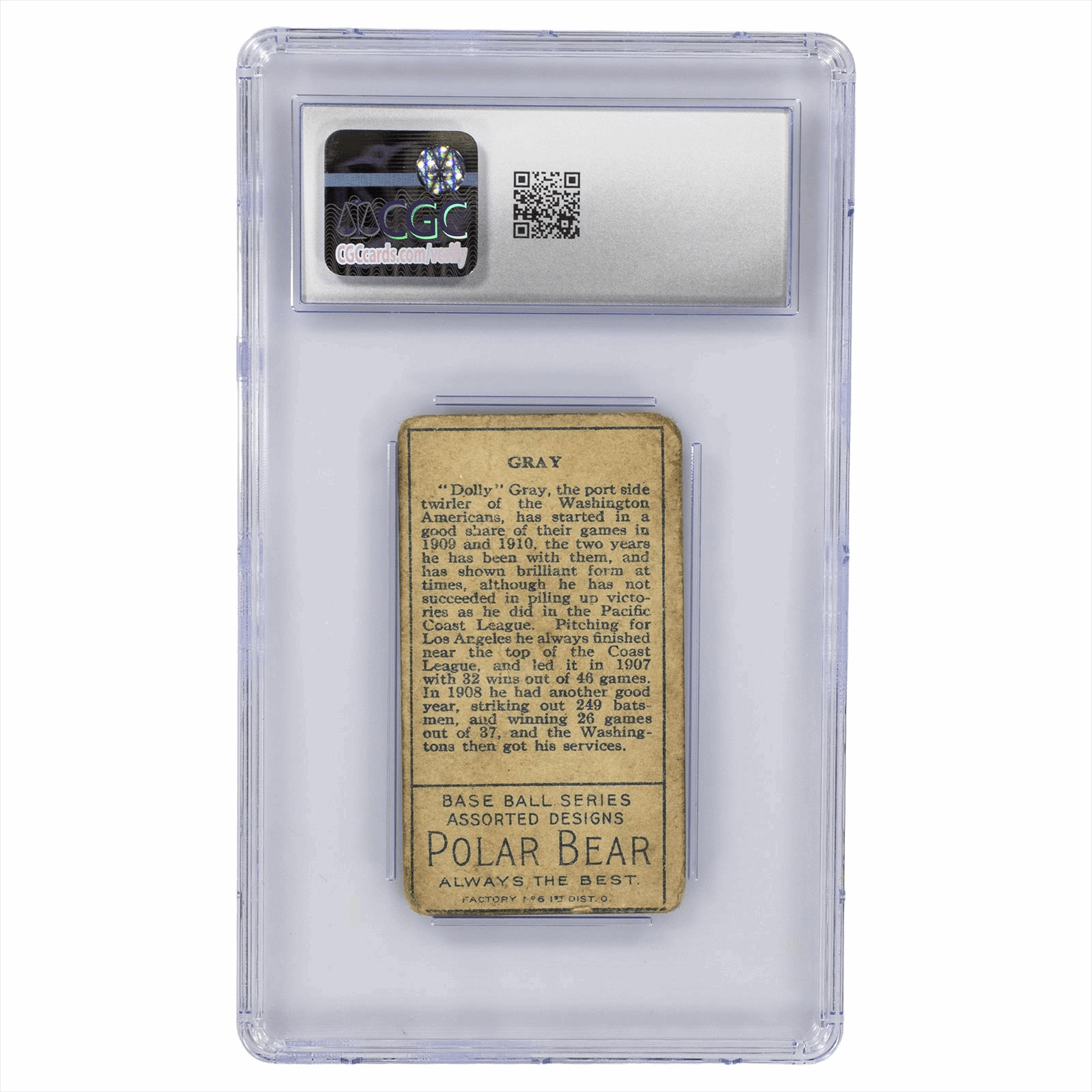 Product Details: 1911 T205 Gold Border Dolly Gray baseball card, featuring a striking portrait of the player. Encapsulated by CGC, this card is graded at Fair 1.5, making it an intriguing collectible for enthusiasts. The vibrant green background enhances the image of Gray, representing the Washington Senators. The reverse side showcases a detailed biography of “Dolly” Gray, highlighting his career, statistics, and achievements. Known for his role as a port side twirler, Gray’s historical significance in baseball is captured within this card. Ideal for collectors seeking to enhance their portfolio with a piece of sports history, this card not only reflects the artistry of early 20th-century baseball cards but also offers a glimpse into the life of a notable player.
