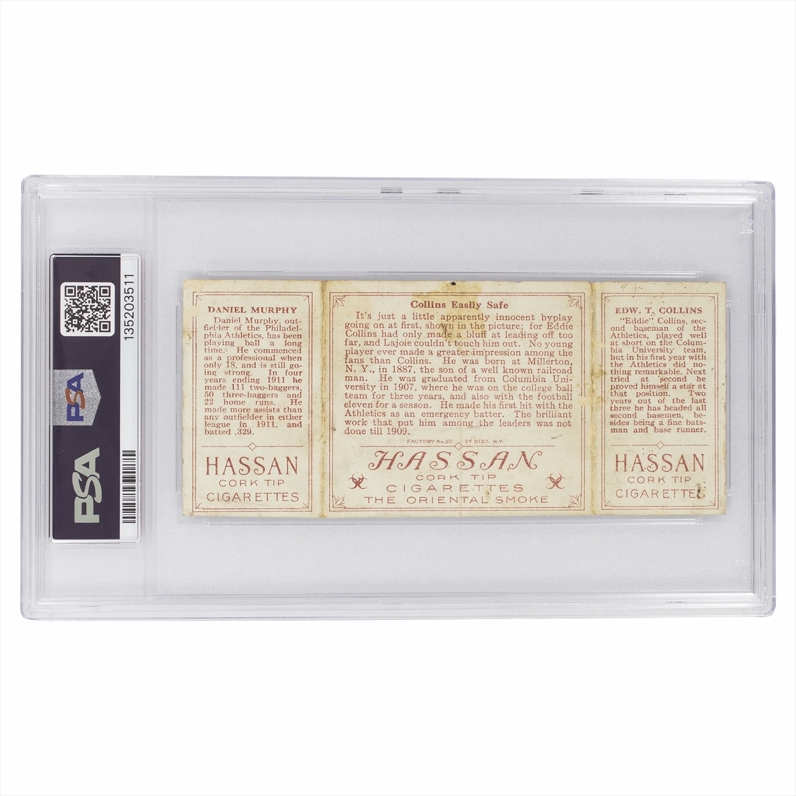 This is a PSA graded card. You will receive the card pictured. You are purchasing a 1912 T202 Hassan Triple Folder E.Collins/D.Murphy Collins Easily Safe PSA PR 1 card. This is an excellent card to add to your collection.