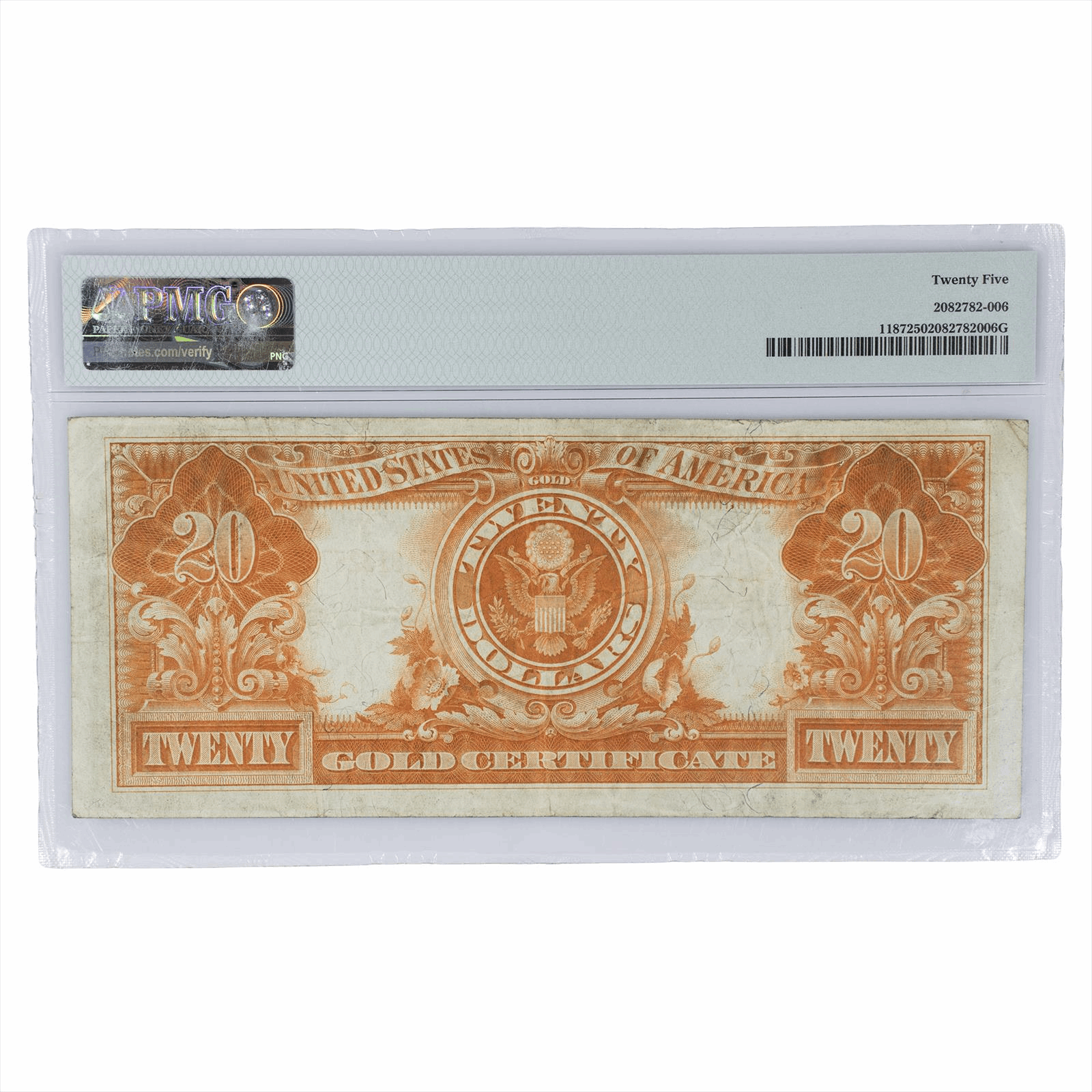 Product Details: This iconic 1922 $20 Gold Certificate (Fr#1187) represents the final series of large-size currency issued by the United States Treasury before the transition to modern small-size notes. Featuring a regal portrait of George Washington on the obverse and a vibrant 'goldback' orange reverse, this note was once fully redeemable for $20 in physical gold coin. Certified by PMG as Very Fine 25, it exhibits honest circulation wear with attractive paper strength and bold, golden-yellow seals and serial numbers. This historic 'yellow boy' is a premier addition for collectors seeking a mid-grade example of America’s most visually striking era of paper money.