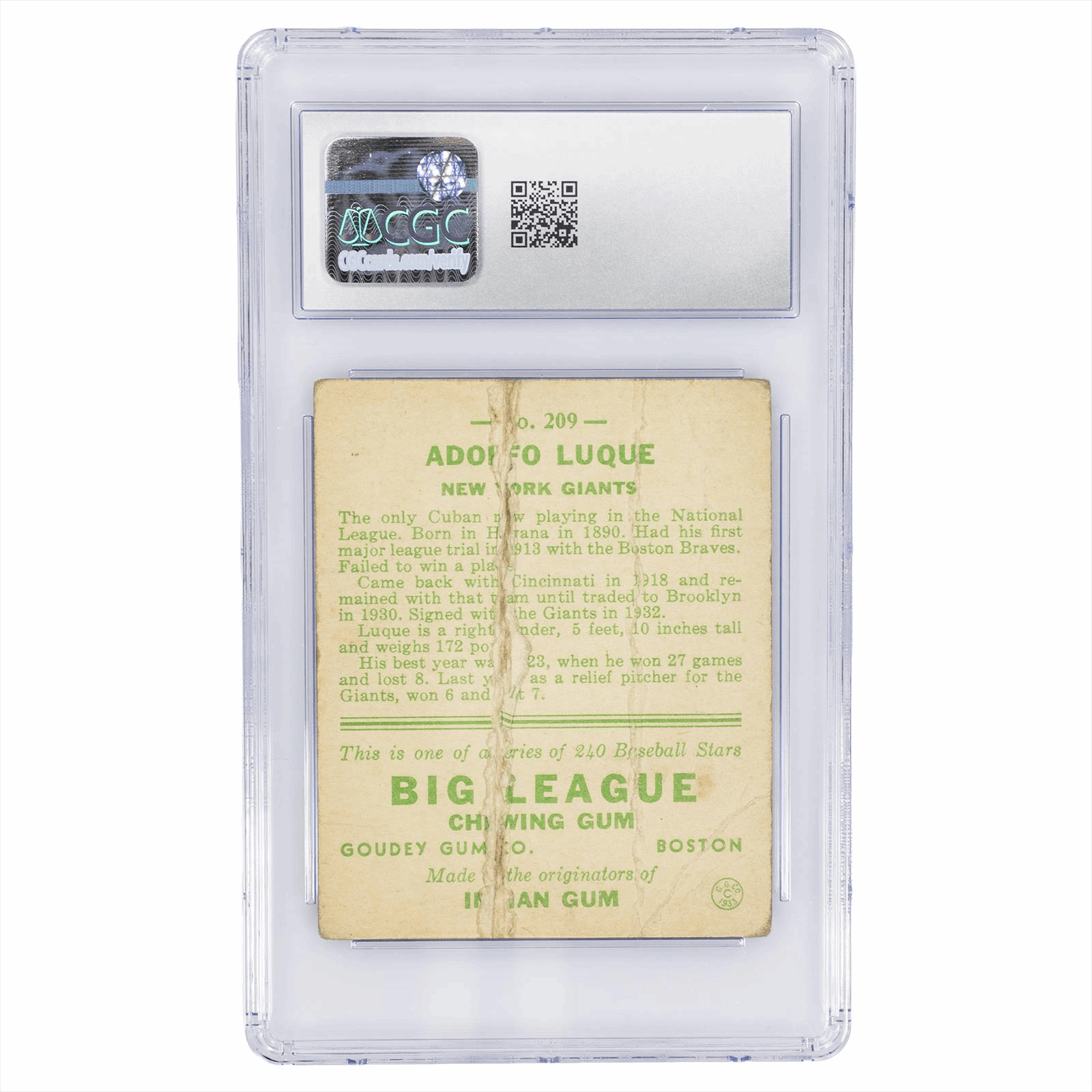 This is a CGC graded card. You will receive the card pictured. You are purchasing a 1933 Goudey Adolfo Luque #209 CGC POOR 1 card. This is an excellent card to add to your collection.