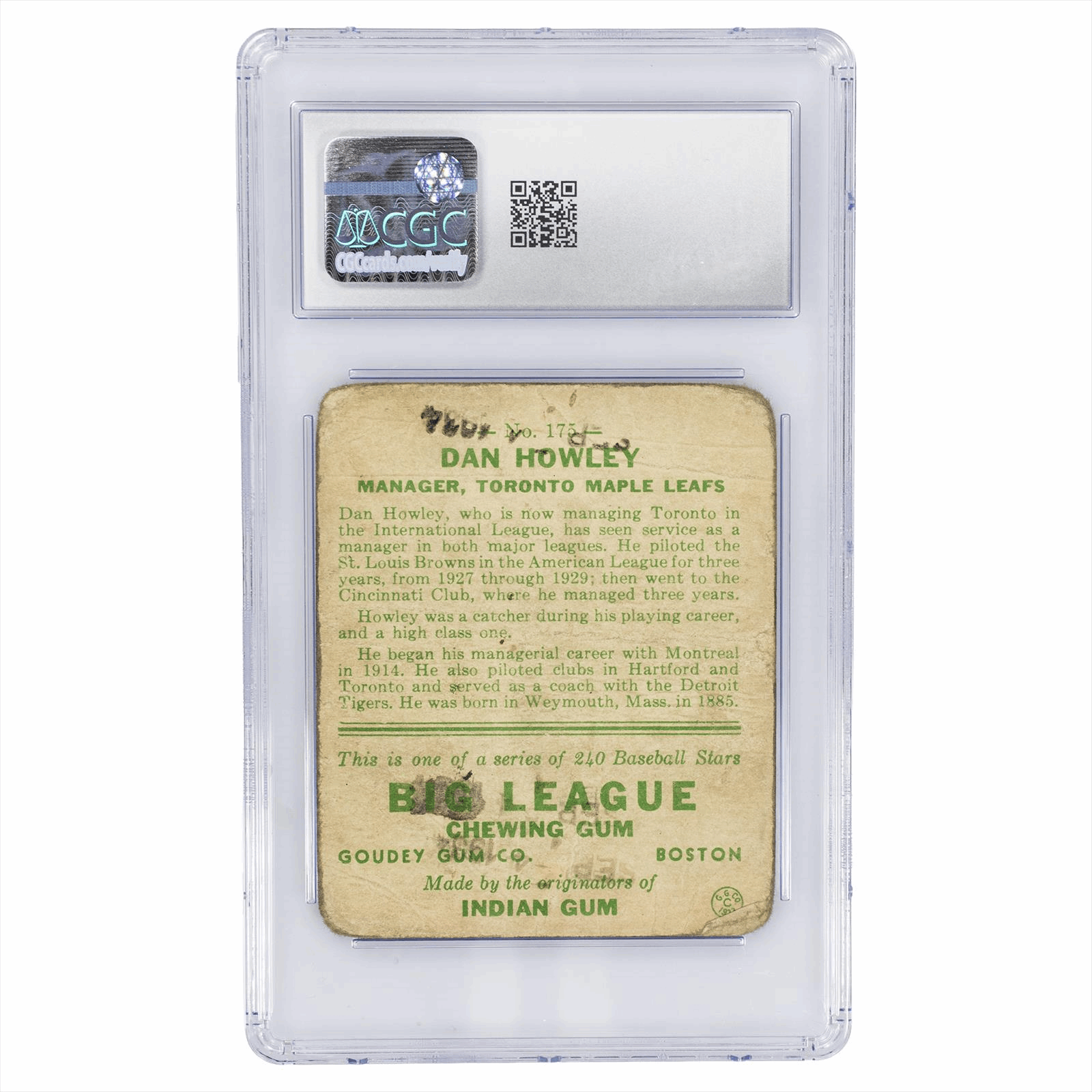 This is a CGC graded card. You will receive the card pictured. You are purchasing a 1933 Goudey Dan Howley #175 CGC POOR 1 card. This is an excellent card to add to your collection.