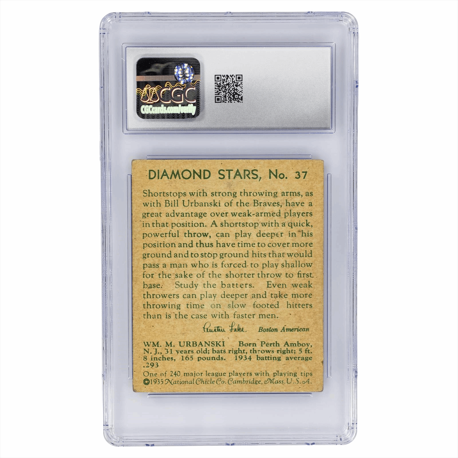 Product Details: Step into the world of vintage baseball memorabilia with this 1934-36 Diamond Stars trading card featuring 'Billie' Urbanski, graded at 4.5 by CGC. This iconic piece showcases Urbanski in his Braves uniform, ready to make a play. The vibrant colors and artistic detail capture the essence of the era, while the back provides fascinating insights into Urbanski's skills and playing style, highlighting the advantages of strong throwing arms for shortstops. A perfect addition for collectors and baseball enthusiasts alike, this card embodies both nostalgia and sports history, commemorating a pinnacle moment in the game.