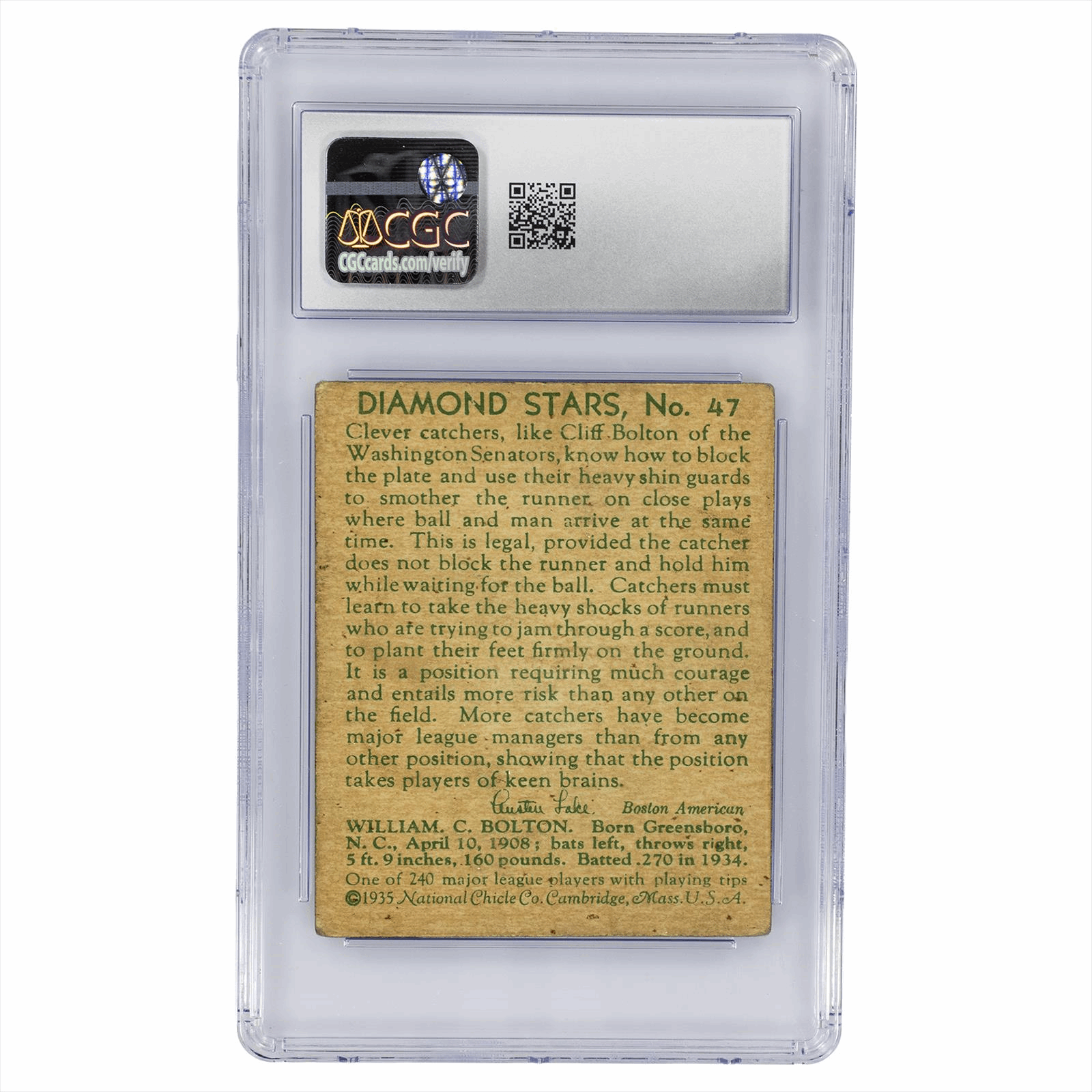 Product Details: 1934-36 Diamond Stars #47 Cliff Bolton baseball card, graded at 3.5 by the Certified Guaranty Company (CGC). This vibrant card features an illustration of Cliff Bolton, a skilled catcher for the Washington Senators, known for his unique blocking techniques. The reverse side provides an intriguing description of Bolton's play style and the skill set required for catchers, emphasizing the courage and strategy necessary for the position. This collectible item is perfect for baseball enthusiasts and card collectors alike, capturing a key moment in sports history. An ideal addition to any vintage card collection, highlighting both artistic and historical significance.