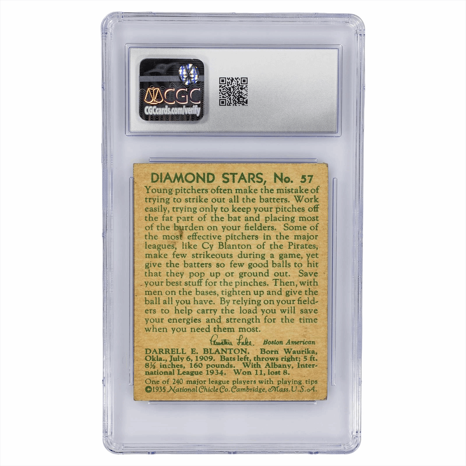 Product Details: 1934-36 Diamond Stars #57 Cy Blanton card, graded at VG 3 by CGC. This vintage baseball card captures the essence of Cy Blanton, showcasing a vibrant portrait of the player in his Pirates uniform. The card not only commemorates Blanton's legacy but also includes insightful text on the reverse, emphasizing strategies for young pitchers and providing a glimpse into Blanton's keen understanding of the game. A perfect addition for collectors and baseball enthusiasts, combining visual appeal with historical significance. Encased for protection, ensuring its condition is preserved for years to come. Card Features: