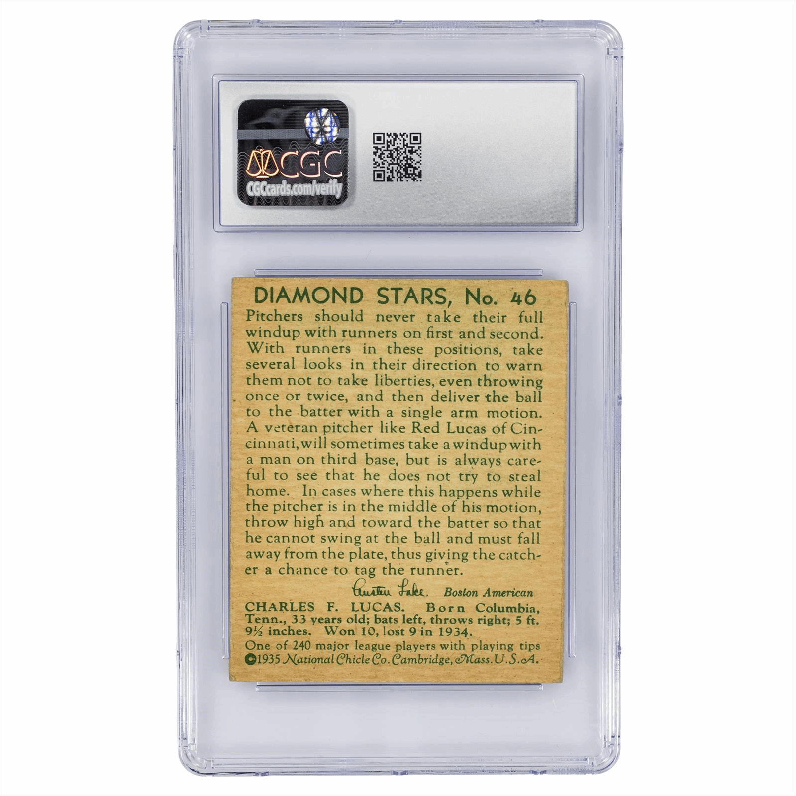 This is a CGC graded card. You will receive the card pictured. You are purchasing a 1934-36 Diamond Stars Red Lucas #46 CGC EX+ 5.5 card. This is an excellent card to add to your collection.