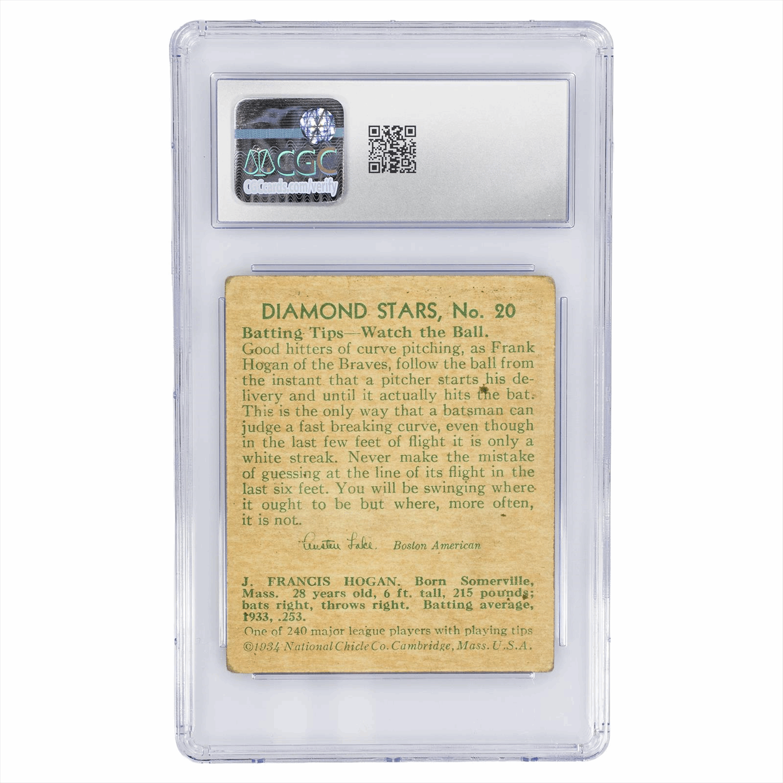 Product Details: 1934-36 Diamond Stars #20 Shanty Hogan baseball card, showcasing the legendary catcher and his authoritative stance on the field. Graded a CGC 2, this card captures the nostalgia of a bygone era with its vibrant colors and intricate design. The reverse features valuable batting tips attributed to Frank Hogan, emphasizing the importance of watching the ball and providing insight into the art of hitting. An intriguing piece of history and a must-have for collectors, this card not only serves as a tribute to Hogan's contributions to the game but also reflects the timeless allure of vintage baseball memorabilia. Perfect for display or addition to any serious collection.