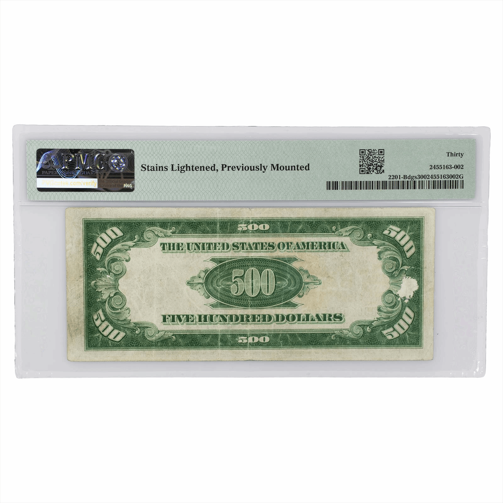 Product Details: 1934 $500 Federal Reserve Note from New York, graded PMG 30 (Very Fine). This collectible currency features a striking dark green design, with the face displaying the portrait of Secretary of the Treasury, Henry Morgenthau Jr. The serial number B00106472A signifies its unique identity. The reverse showcases the denomination in elegant detail, complemented by intricate patterns and engravings. A remarkable piece of history, previously mounted yet retaining its charm with lightened stains. Ideal for collectors and enthusiasts alike, this note exemplifies the artistry and significance of American currency.
