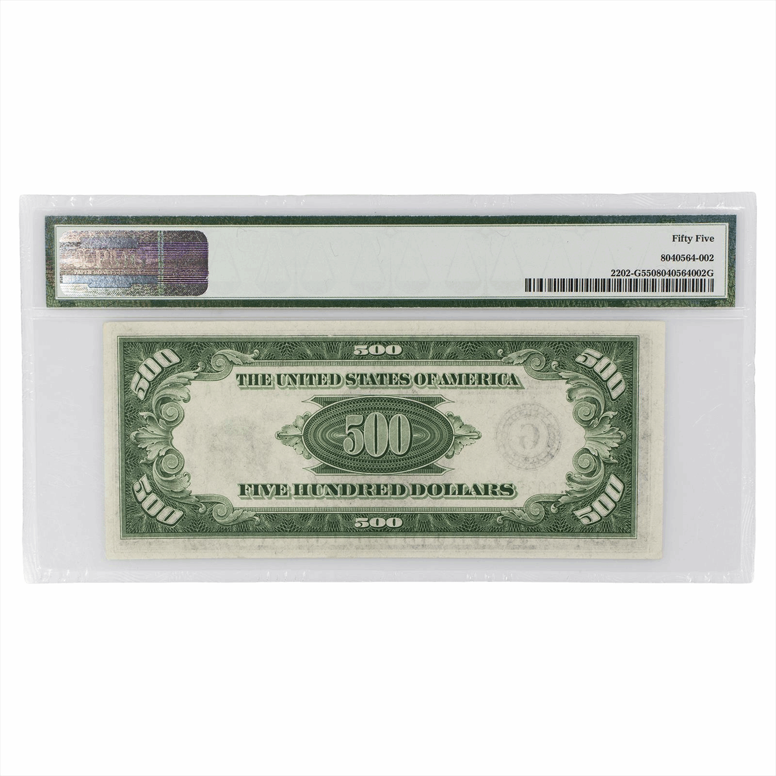 Product Details: Own a piece of American financial history with this stunning and highly coveted 1934A Federal Reserve Note, a $500 bill issued by the Federal Reserve Bank of Chicago. This specific note, with its unique serial number G00355301AA, represents a remarkable intersection of rarity, historical significance, and exceptional preservation. This note has been professionally graded by PMG (Paper Money Guaranty), one of the world's leading third-party numismatic grading services, as AU 55 (About Uncirculated). This grade signifies that the note retains much of its original crispness and vibrant color, showing only minimal signs of handling. The corners are sharp, and the paper is firm, with very light folds or creases that do not detract from its overall stunning appearance. Secure your piece of American history today!