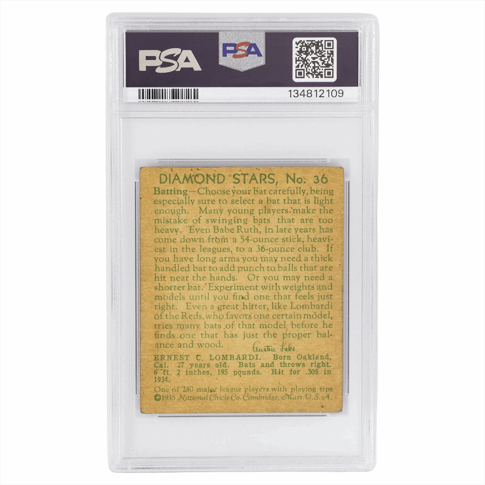 This is a PSA graded card. You will receive the card pictured. You are purchasing a 1935 Diamond Stars Ernie Lombardi Earnie #36 PSA GOOD 2 card. This is an excellent card to add to your collection.