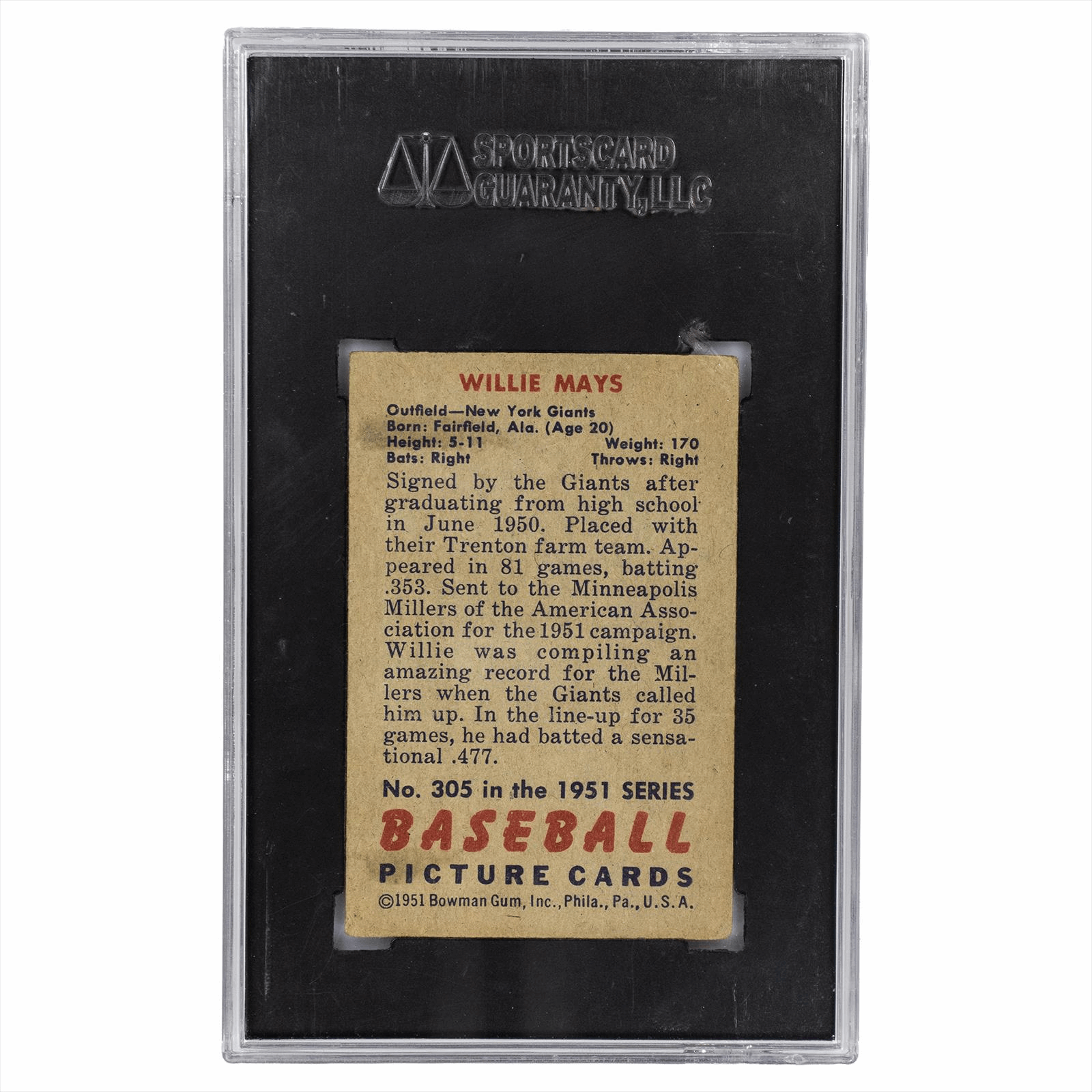 This is a SGC graded card. You will receive the card pictured. You are purchasing a 1951 Bowman Willie Mays #305 SGC GOOD 2 card. This is an excellent card to add to your collection.