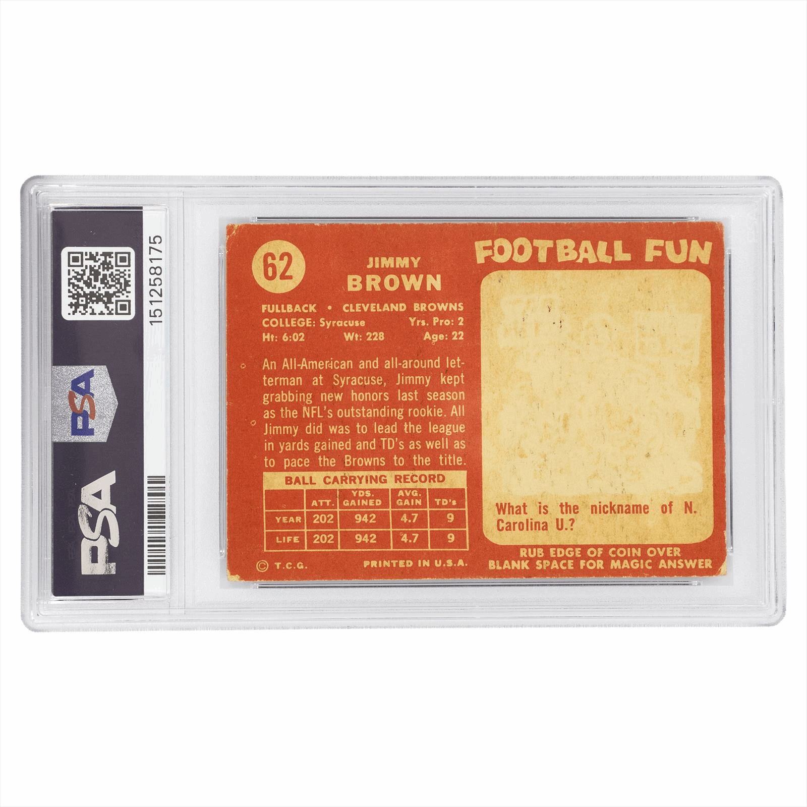 Product Details: This iconic 1958 Topps Jim Brown #62 rookie card represents a cornerstone of football card collecting, featuring the legendary Cleveland Browns fullback in his debut year. Graded PSA FR 1.5 (Fair), this specific example (Cert #151258175) offers an affordable entry point for collectors seeking the 'Mount Rushmore' of gridiron cards without the premium price of high-grade specimens. The card displays the classic design of Brown in a running pose set against a rich, dark background that naturally emphasizes his powerful presence. Despite its modest grade, the card maintains the historic 'Jimmy Brown' yellow lettering on the front, serving as a tangible piece of NFL history from one of the greatest athletes to ever play the game.