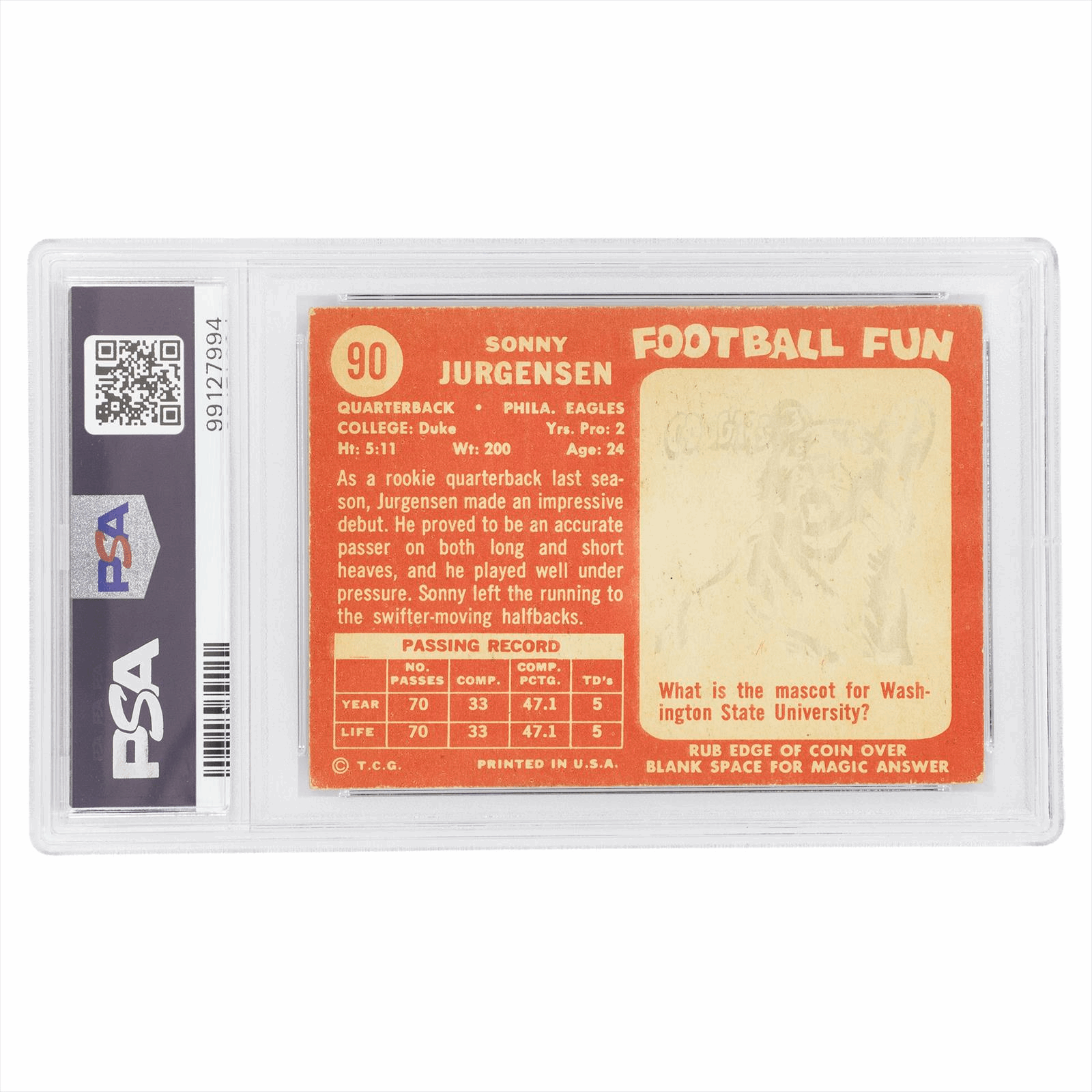 This is a PSA graded card. You will receive the card pictured. You are purchasing a 1958 Topps Sonny Jurgensen #90 VG-EX4 AUTO 10 card. This is an excellent card to add to your collection.