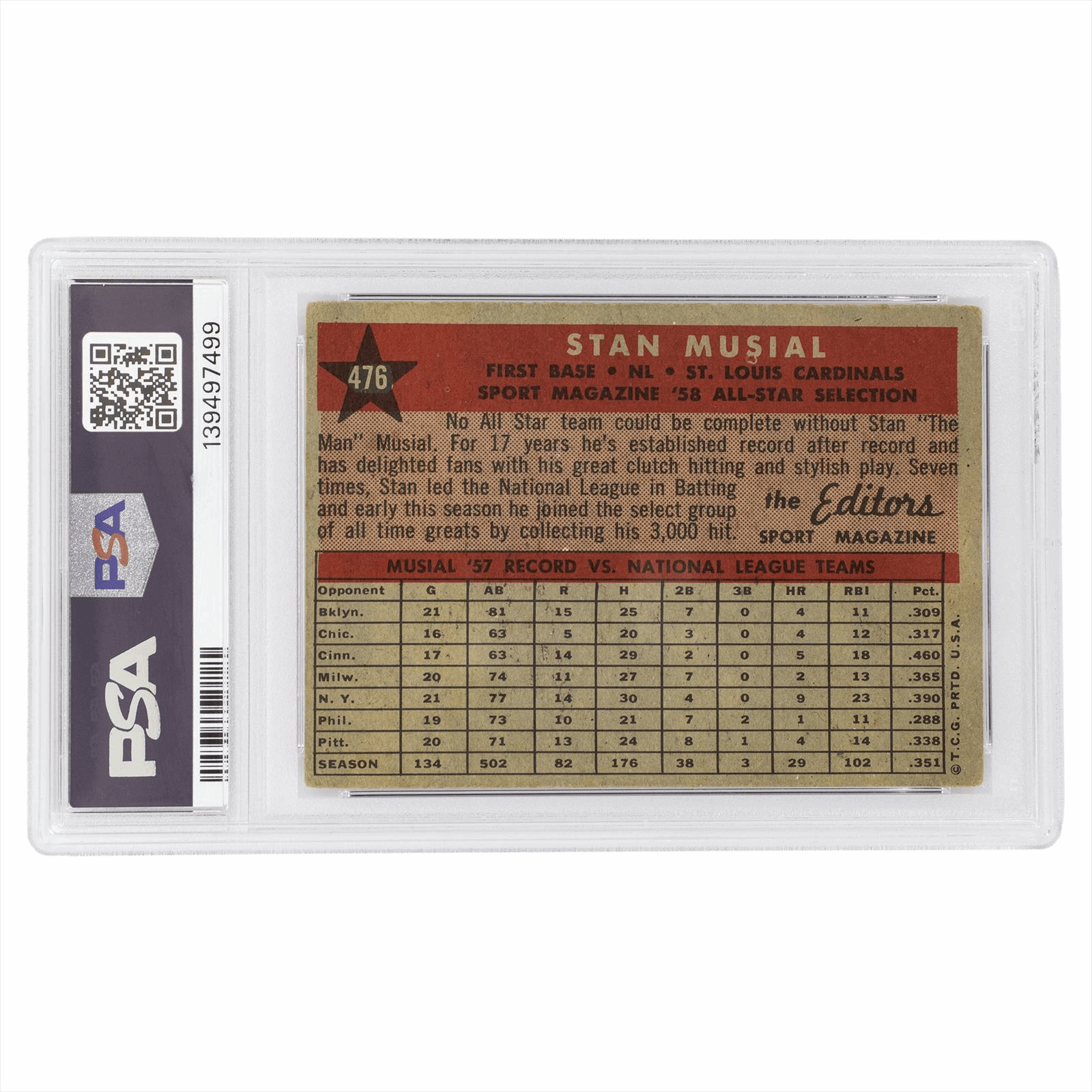This is a PSA graded card. You will receive the card pictured. You are purchasing a 1958 Topps Stan Musial All Star #476 PSA VG 3 card. This is an excellent card to add to your collection.