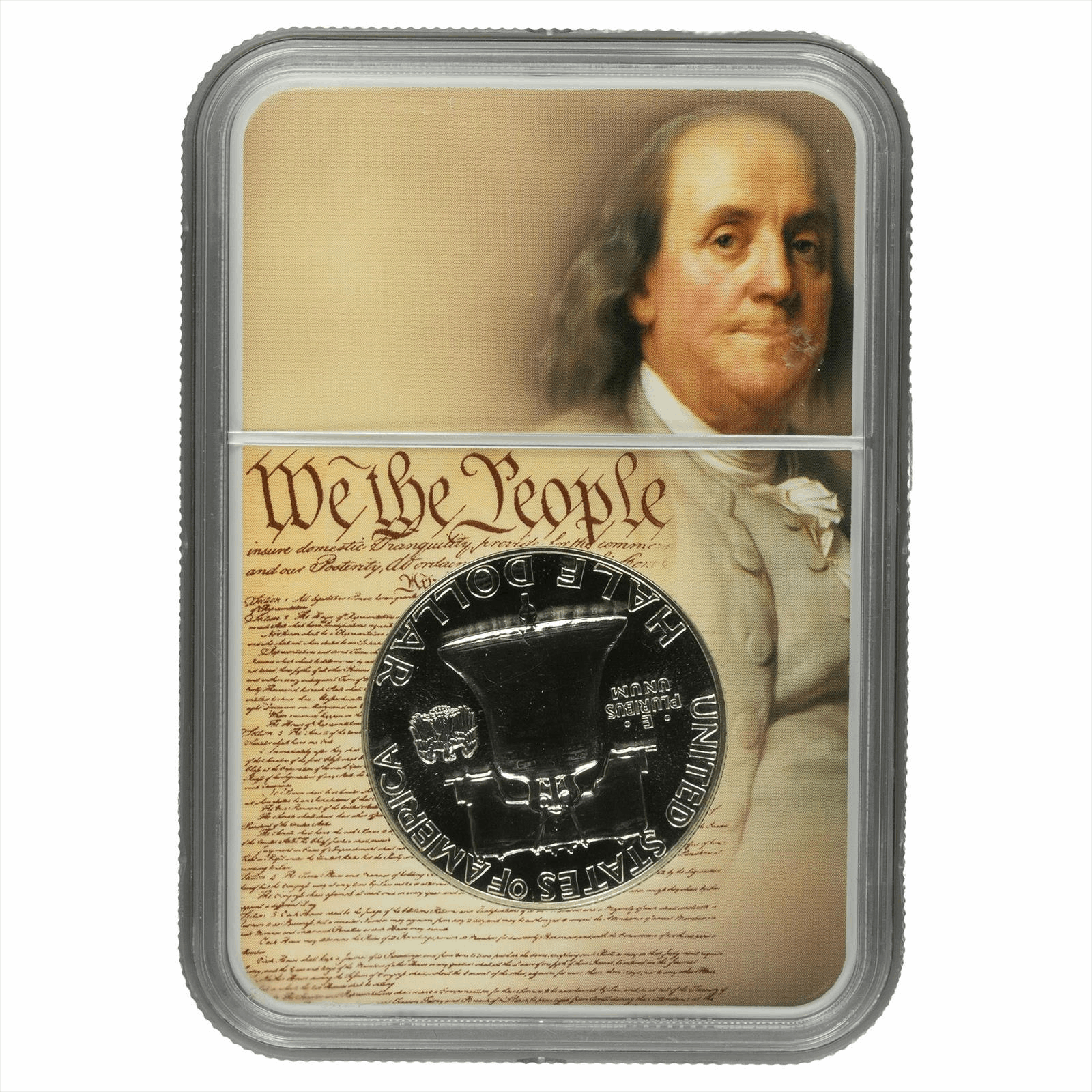 Product Details: 1959 Half Dollar in pristine condition, graded PF 68 by NGC. This collectible coin features the iconic visage of Benjamin Franklin, representing liberty and trust. The reverse showcases the classic design with a depiction of the Philadelphia bell, symbolizing freedom and American heritage. Encased in a protective holder, the coin is not only a remarkable piece for collectors but also a piece of history, beautifully presented against a backdrop of the U.S. Constitution, adorned with the phrase 'We the People.' Ideal for numismatists and history enthusiasts alike, this coin exemplifies American craftsmanship and significance. Perfect as a gift or for personal collections.