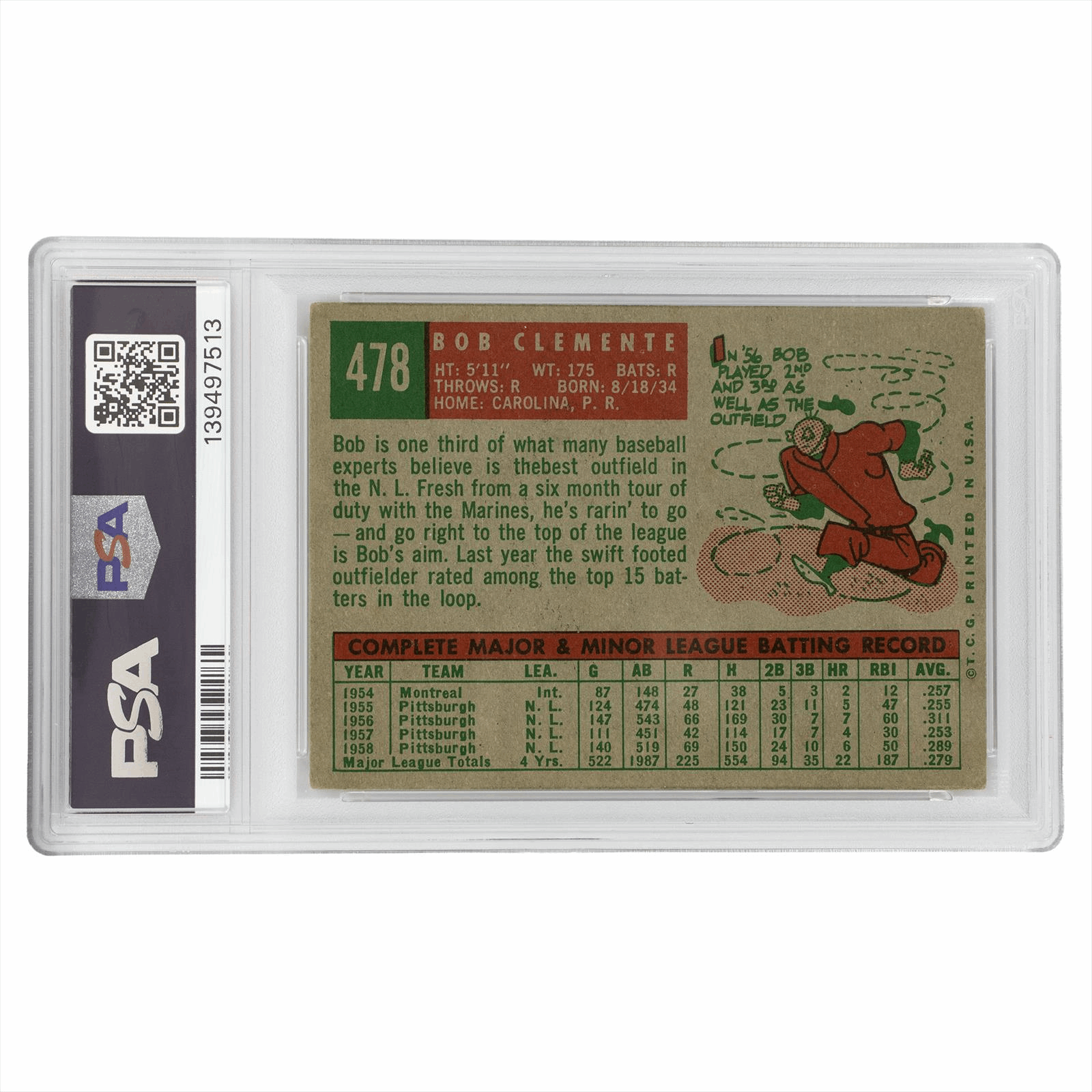This is a PSA graded card. You will receive the card pictured. You are purchasing a 1959 Topps Bob Clemente #478 PSA VG+ 3.5 card. This is an excellent card to add to your collection.