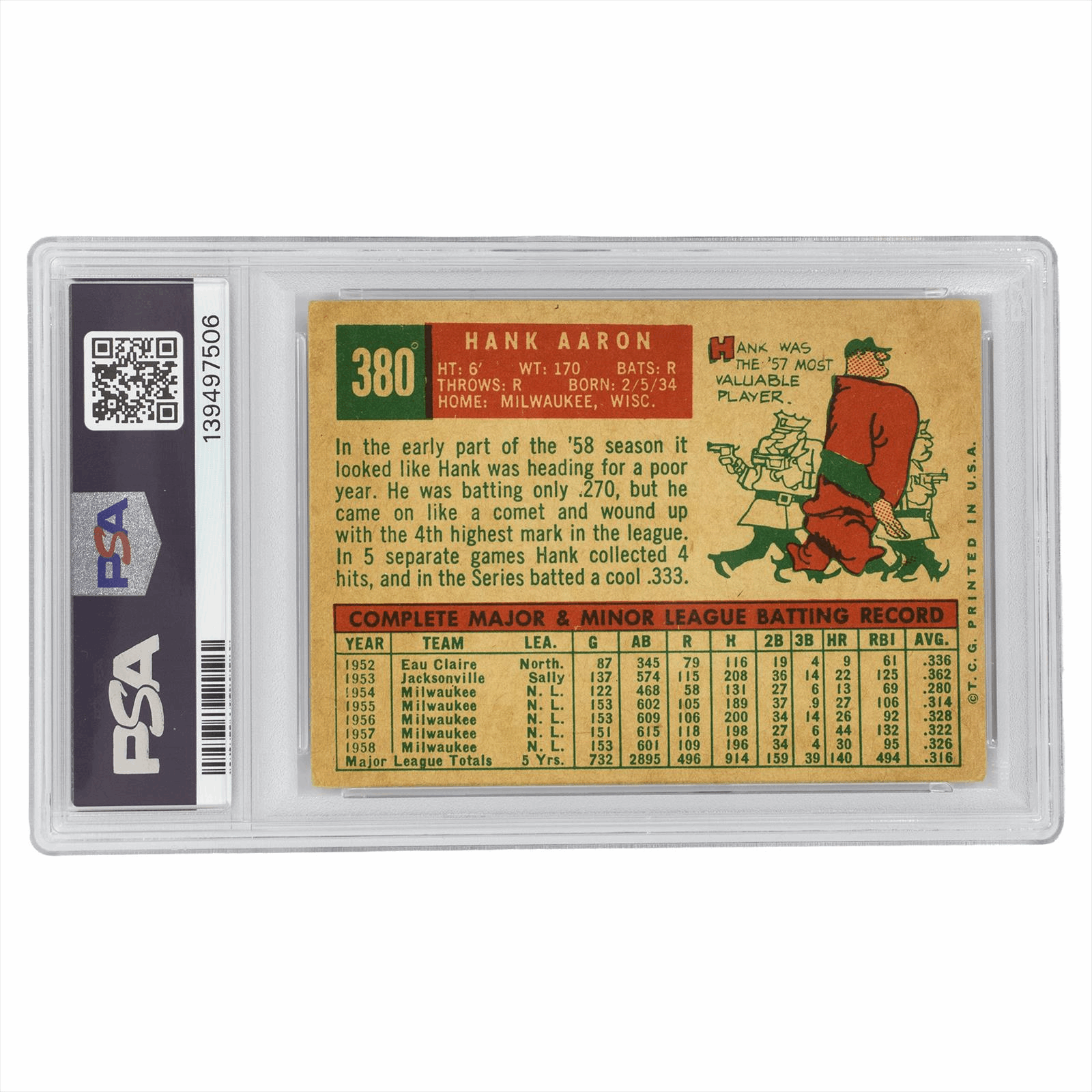 This is a PSA graded card. You will receive the card pictured. You are purchasing a 1959 Topps Hank Aaron #380 PSA GOOD+ 2.5 card. This is an excellent card to add to your collection.
