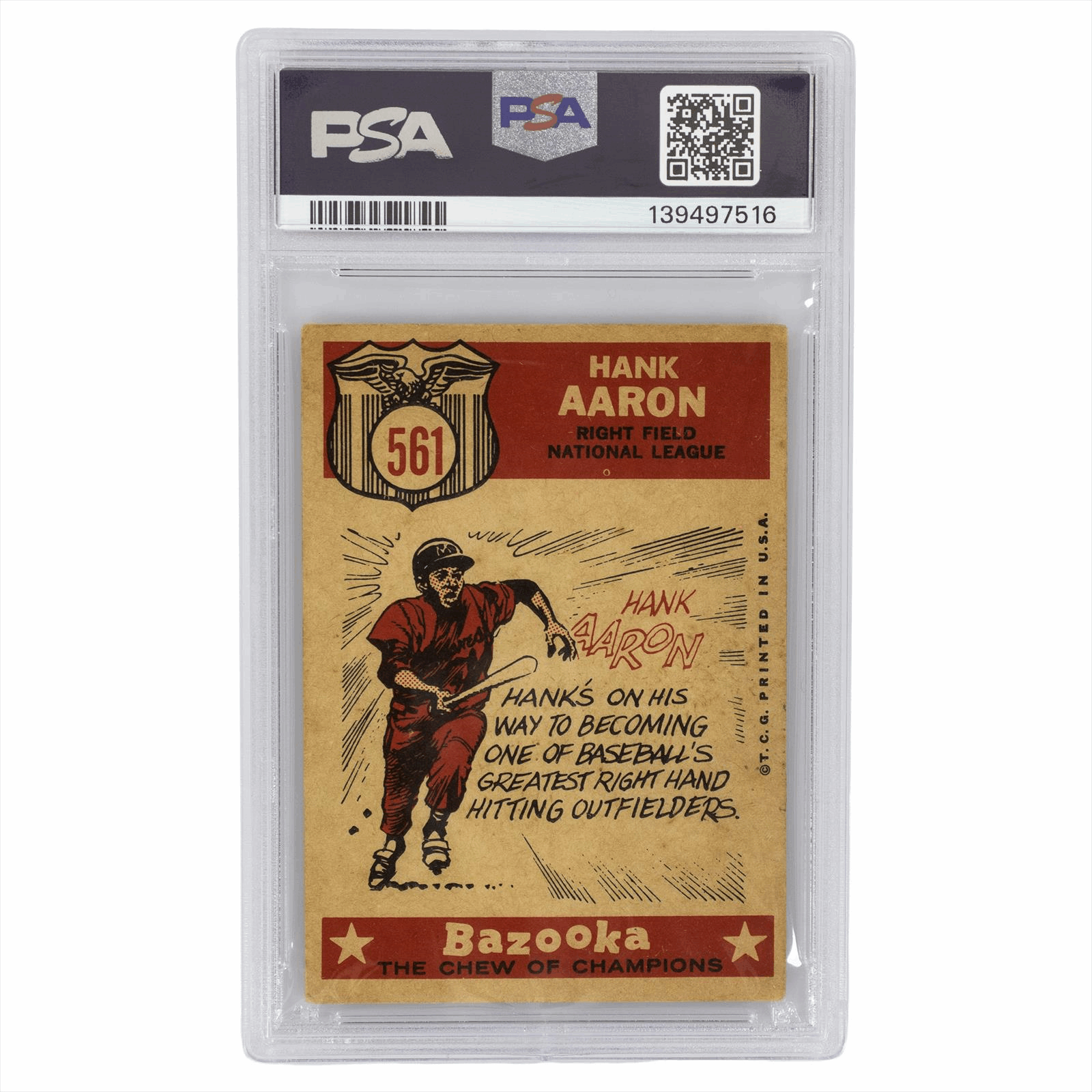 Product Details: 1959 Topps Hank Aaron All-Star baseball card, graded PSA 2, showcases a historic moment in baseball history. Card #561 features Hank Aaron in a classic Braves uniform, capturing his skills as a right fielder in the National League. The card's design highlights vibrant colors, emphasizing Aaron's significance as a player and his selection in the '59 All-Star roster. The reverse side includes a unique Bazooka illustration, celebrating his journey as one of baseball's greatest right-handed hitters. Encased for protection, this rare collectible piece is perfect for fans and collectors seeking to honor Hank Aaron's legacy in the world of sports. Ideal for display or as a treasured addition to any collection.