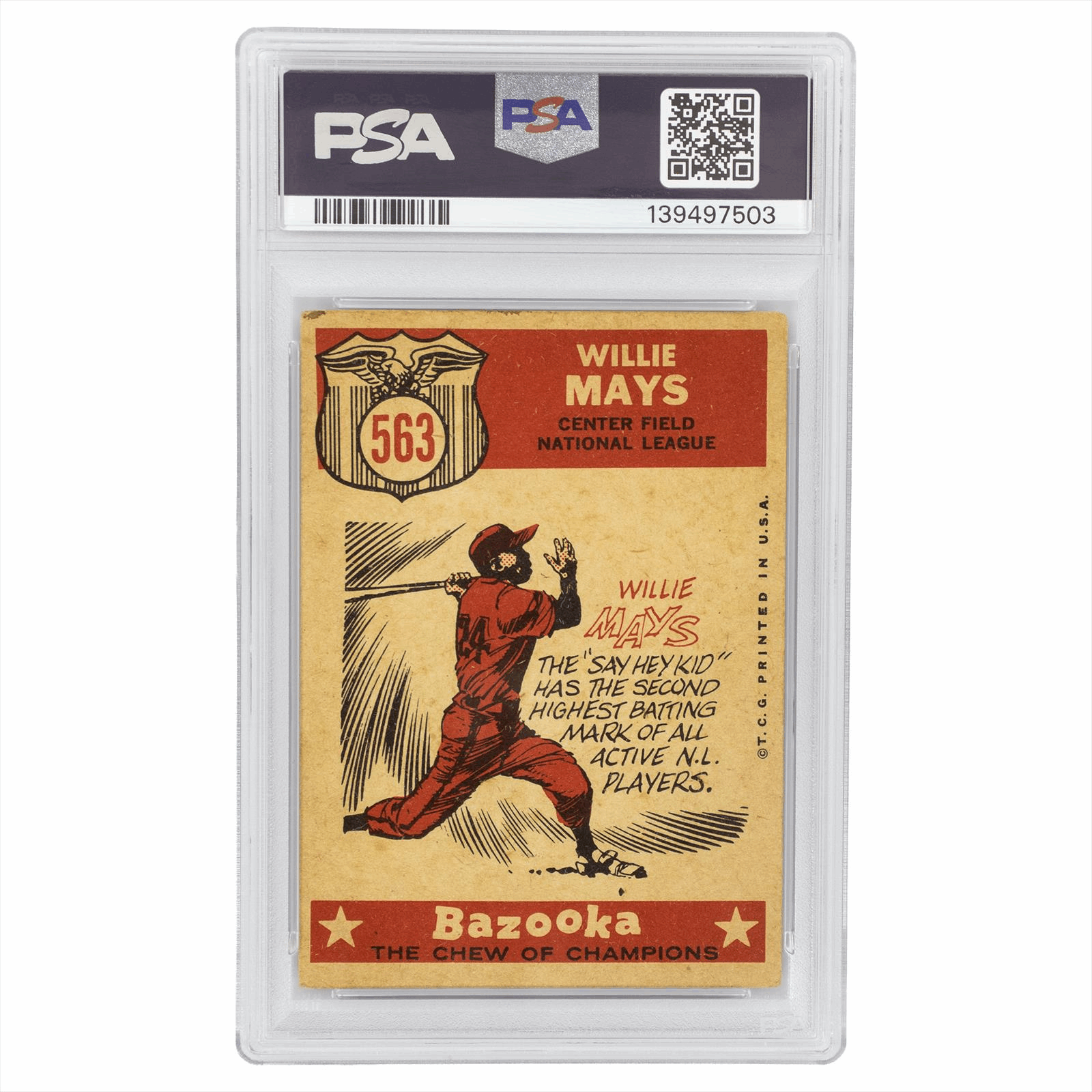 Product Details: 1959 Topps Willie Mays All-Star baseball card, graded PSA 3, featuring vivid imagery of the legendary center fielder. This card is numbered #563 and highlights Mays as an All-Star selection for the year. The front displays an iconic portrait alongside a striking red background with “The Sporting News” logo, emphasizing Mays’s significance in baseball history. The reverse showcases a nostalgic Bazooka advertisement, highlighting Mays's impressive stats and contributions to the game. This collectible card is perfect for enthusiasts and collectors alike, encapsulating a legendary era in baseball with both visual appeal and historical importance. A must-have addition for any serious collection. Card Features: