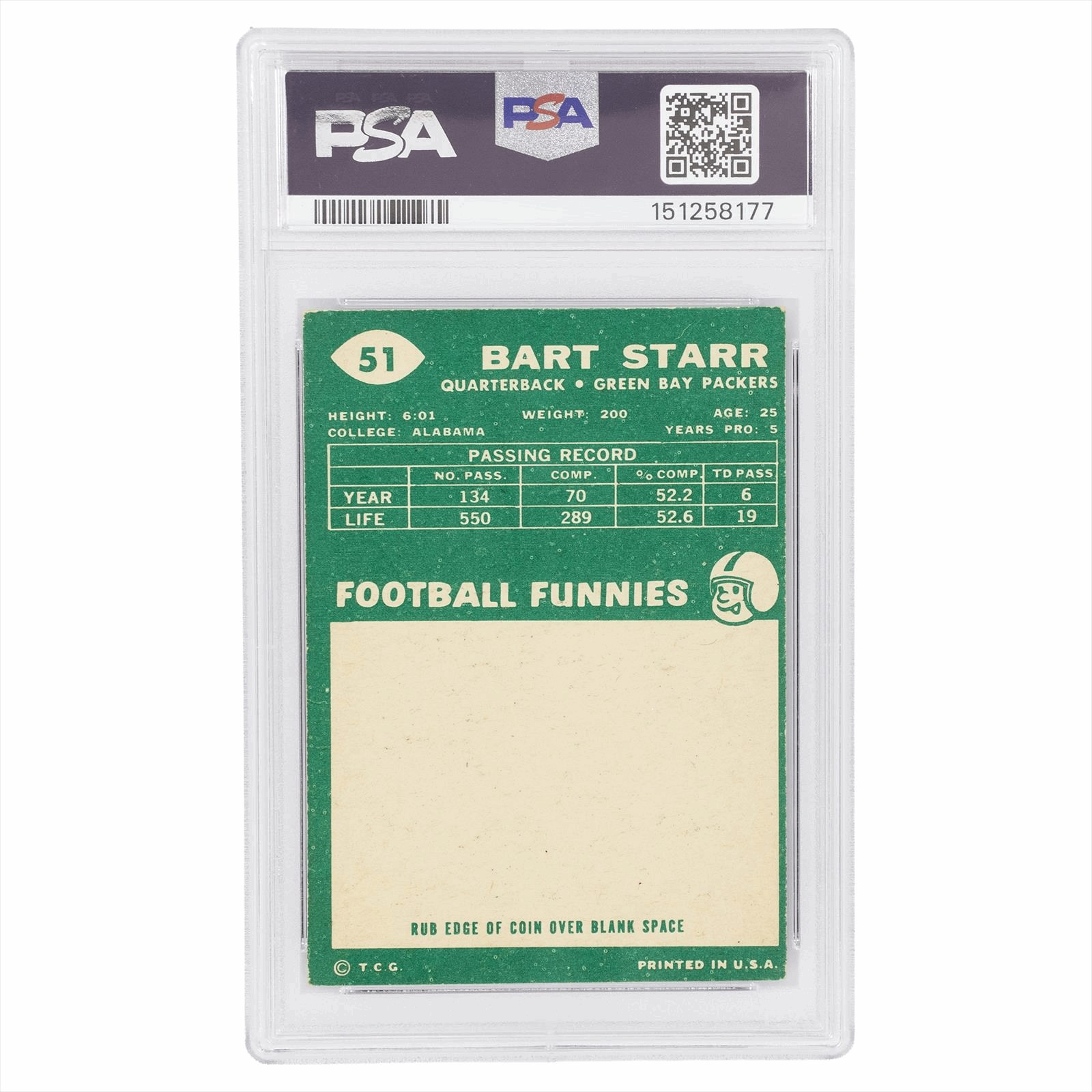 Product Details: This 1960 Topps Bart Starr #51 is a quintessential vintage piece for any Green Bay Packers enthusiast or football card historian. Professionally graded by PSA as VG 3 (Very Good), the card features a vibrant color portrait of the legendary Hall of Fame quarterback framed by the classic white borders of the 1960 set. This specific collectible is securely encapsulated and registered under PSA Cert #151258177, ensuring its authenticity and long-term preservation for your collection. As one of the key anchor stars of the 132-card set, this Bart Starr issue captures the iconic 'Glory Years' era of football in a highly collectible and accessible grade.