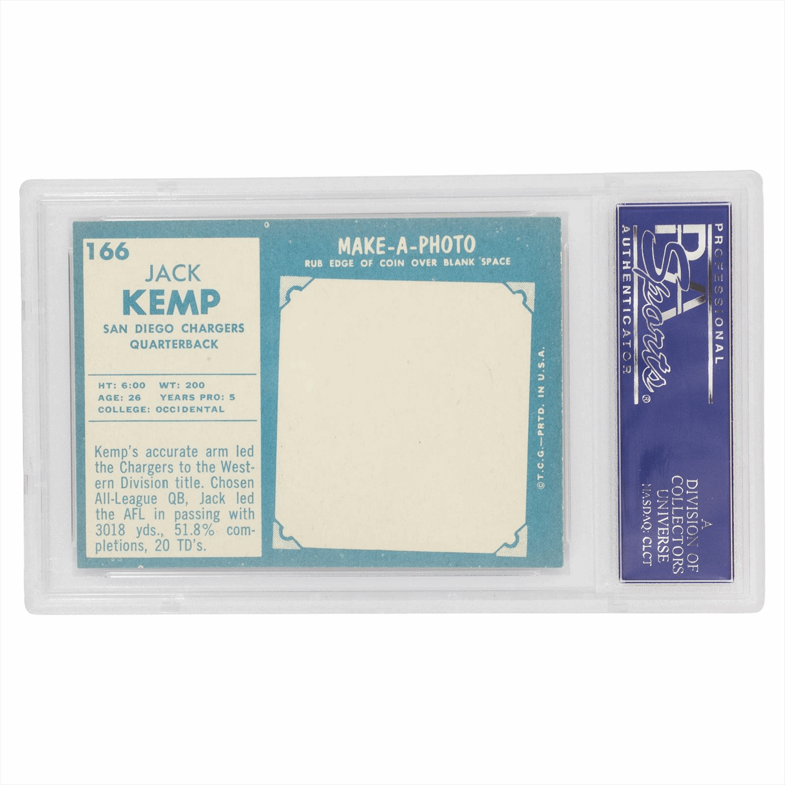 This is a PSA graded card. You will receive the card pictured. You are purchasing a 1961 Topps Jack Kemp #166 PSA NM 7 card. This is an excellent card to add to your collection.