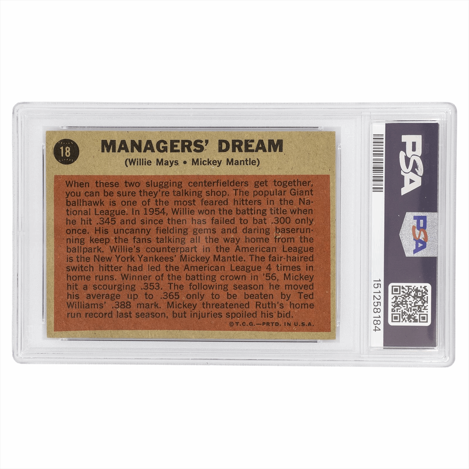 This is a PSA graded card. You will receive the card pictured. You are purchasing a 1962 Topps Managers Dream Mantle / Mays #18 PSA VG 3 card. This is an excellent card to add to your collection.