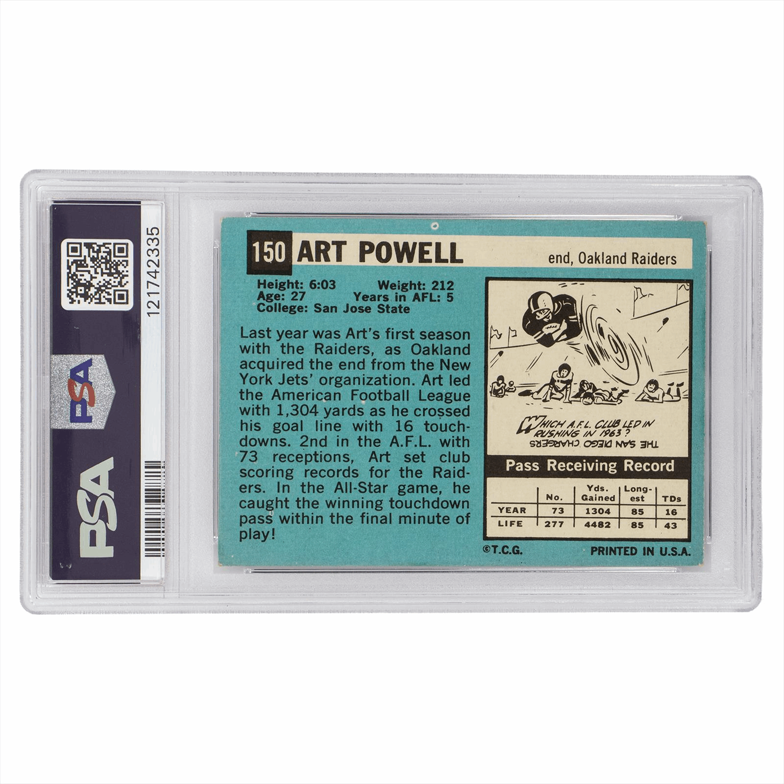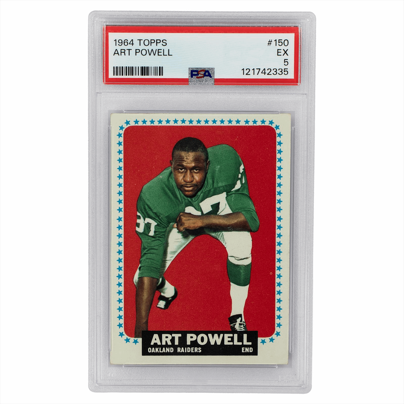 Product Details: 1964 Topps Art Powell Football Card #150 showcases the dynamic talent of this Oakland Raiders end. Graded EX 5 by PSA, this card features a vibrant red background that highlights Powell's keen demeanor. On the back, detailed statistics reveal his impressive season, including 1,304 receiving yards and 16 touchdowns. His notable achievements also include setting club records for receptions. Perfect for collectors and fans, this card is an iconic piece of NFL history, capturing a significant moment in Art Powell's career.