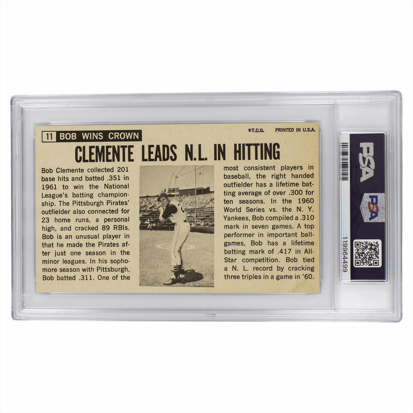 Product Details: 1964 Topps Giants Bob Clemente collectible card, graded EX-MT 6 by PSA, features a stunning portrait of the legendary baseball player. Known for his exceptional talent, Clemente not only shone as an outfielder for the Pittsburgh Pirates but also led the National League in hitting with a remarkable .351 batting average in 1961. The reverse side highlights his career achievements, including 201 base hits and 23 home runs during that memorable season. A must-have for any sports memorabilia collector, this card captures a significant moment in baseball history, celebrating an icon whose legacy continues to inspire. Perfect for display or as a unique addition to any collection.