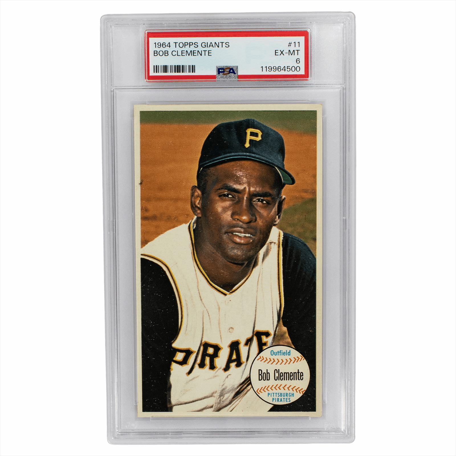 Product Details: 1964 Topps Giants Bob Clemente baseball card (#11) in EX-MT condition, graded by PSA. A striking representation of the legendary Pittsburgh Pirates outfielder, showcasing his talent and charisma. The front features a vibrant image, capturing Clemente in his classic Pirates uniform. The back includes a detailed biography highlighting his remarkable achievements, including leading the National League in hitting and boasting a lifetime batting average over .300. Encased in a protective case, this collectible is a must-have for baseball enthusiasts and collectors alike. Perfect addition to any sports memorabilia collection.