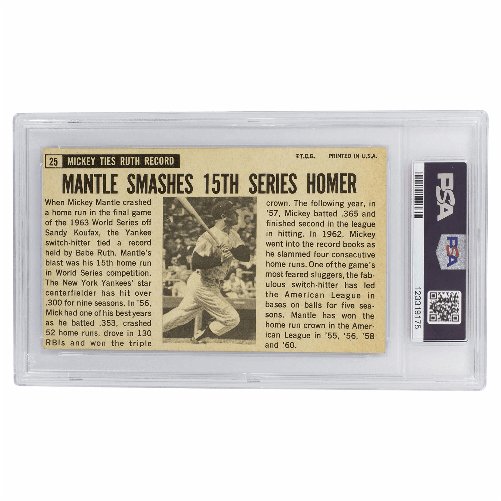 Product Details: 1964 Topps Giants Mickey Mantle baseball card, graded EX 5 by PSA. This collectible features a vibrant image of Mantle in his iconic New York Yankees cap, capturing the essence of a legendary career. The reverse side highlights Mantle's achievement of smashing his 15th home run in World Series history, tying Babe Ruth's record. A must-have for any baseball aficionado, this card embodies both history and nostalgia, making it a centerpiece in any collection. Encased for protection and display, it offers a glimpse into the storied past of one of baseball's greatest icons. Card Features:
