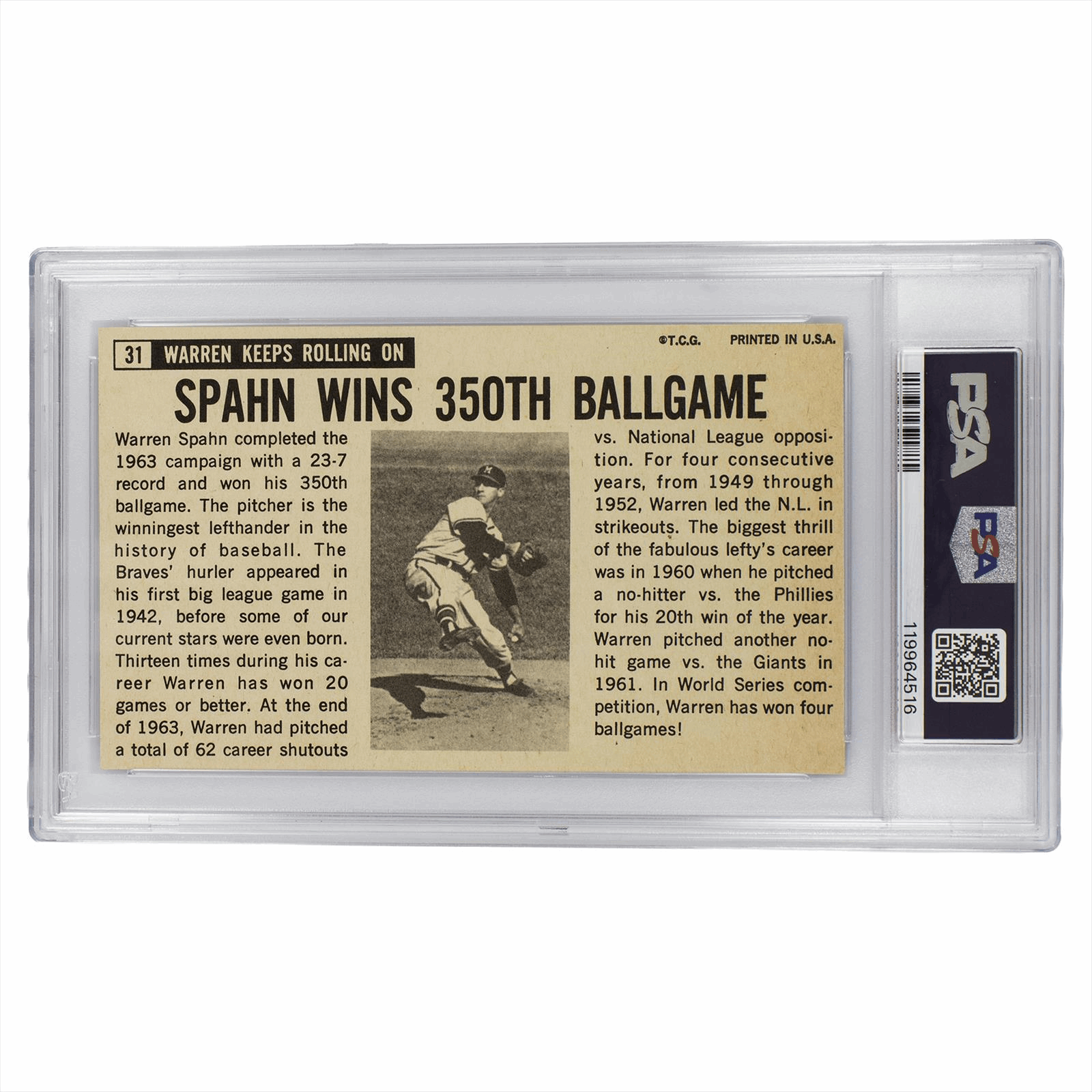 Product Details: 1964 Topps Giants #31 Warren Spahn card, graded NM 7 by PSA. This collectible features a striking portrait of Warren Spahn wearing his Milwaukee Braves cap, embodying the charm of vintage baseball memorabilia. The reverse highlights his impressive career milestones, including his 350th ballgame and notable achievements as a left-handed pitcher. A must-have for baseball enthusiasts and collectors alike, this card captures a pivotal moment in the history of baseball. Display it proudly or add it to your collection to celebrate the legacy of a true baseball icon.