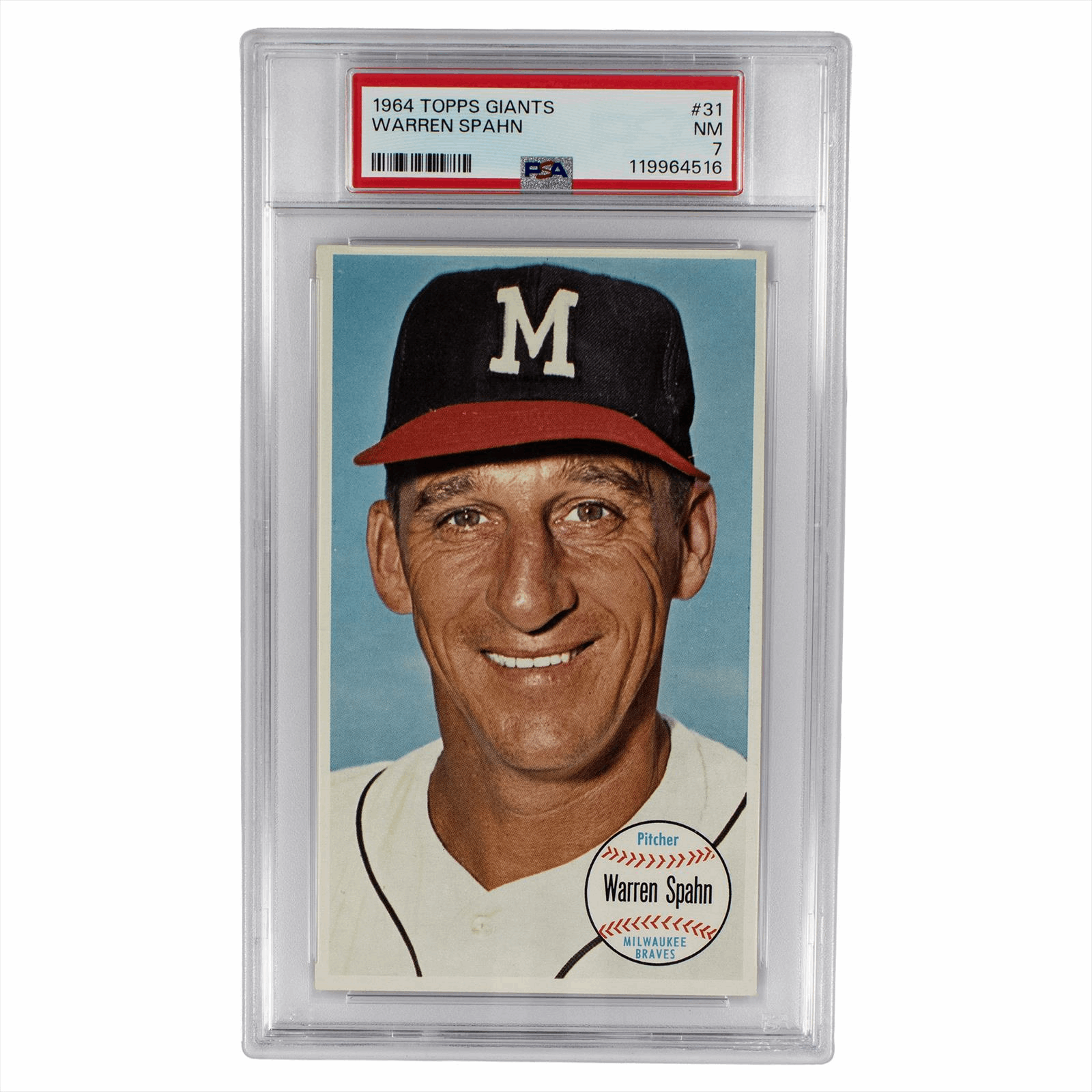 This is a PSA graded card. You will receive the card pictured. You are purchasing a 1964 Topps Giants Warren Spahn #31 PSA NM 7 card. This is an excellent card to add to your collection.